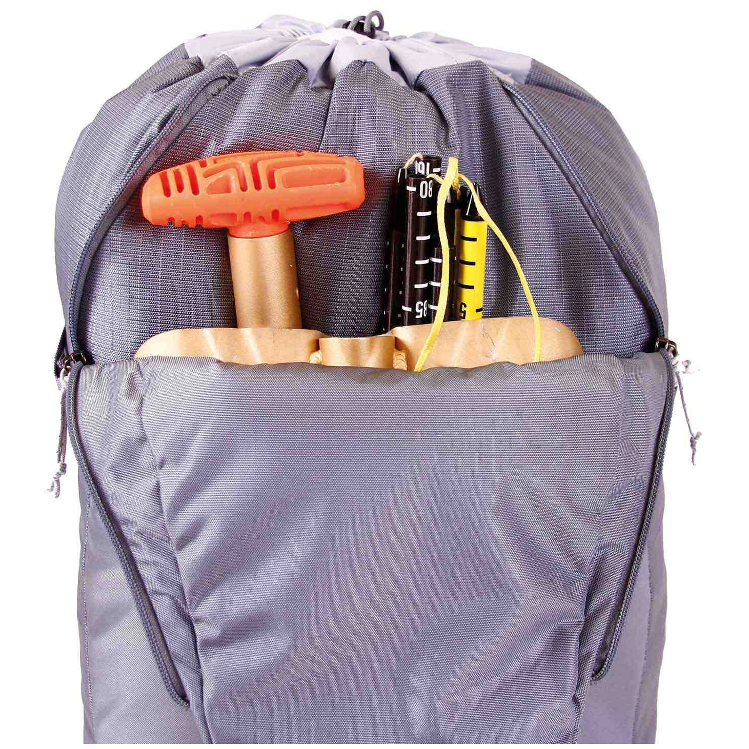 Der Rucksack verfügt über eine separate, wasser- und schneeabweisende Tasche , eine vertikale Tasche mit Schnellzugriff-Reißverschluss beispielsweise für ein Seil. Der Rucksack verfügt außerdem über einen Hüftgurt , an dem sich praktische Reißverschlusstaschen befinden, beispielsweise für ein Mobiltelefon oder andere kleine Gegenstände, die wir schnell zur Hand haben müssen. Ein Helmgurt ist ebenfalls vorhanden.
