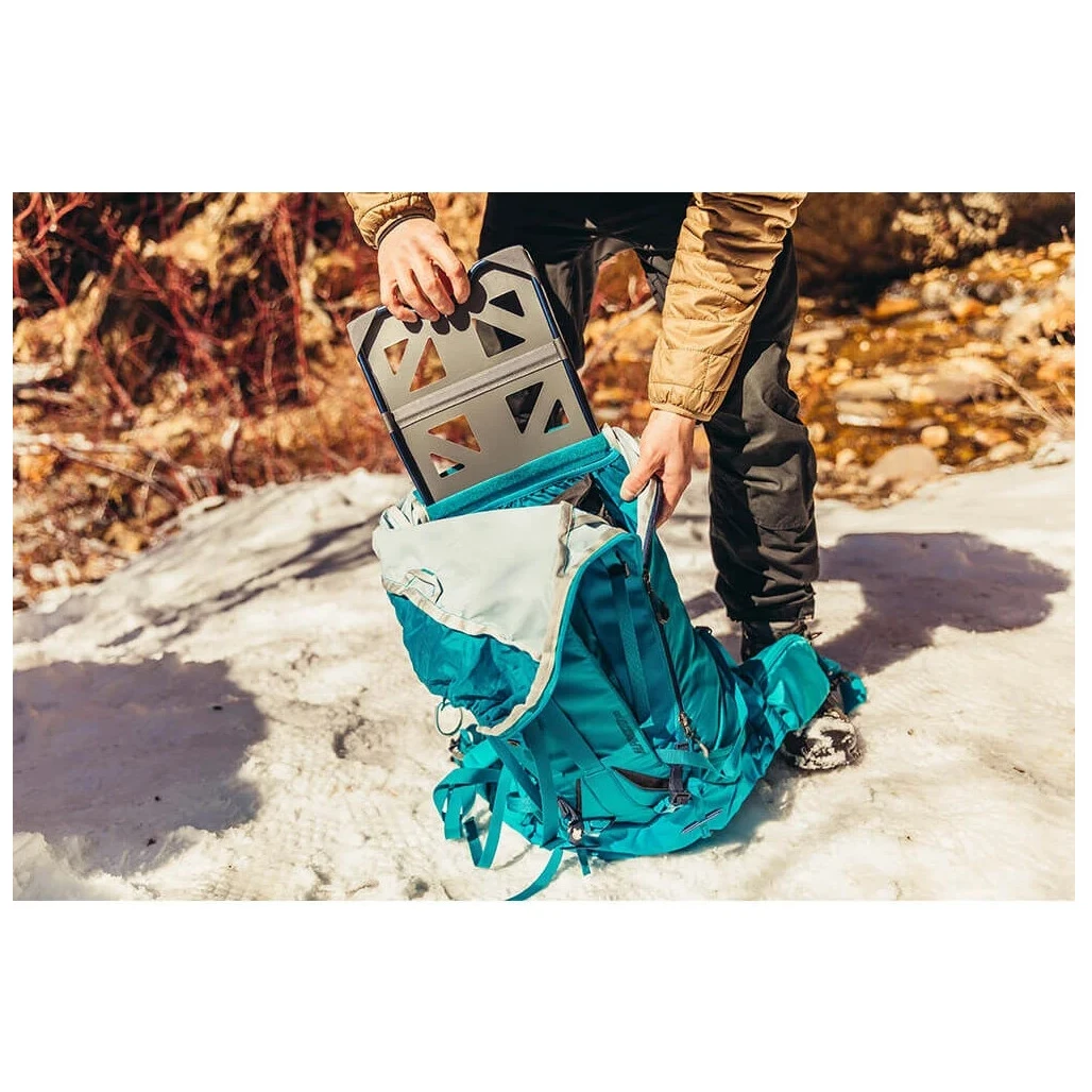- abnehmbare Elemente: Aluminiumrahmen, Verstärkungen und Hüftgurt zur Reduzierung des Rucksackgewichts