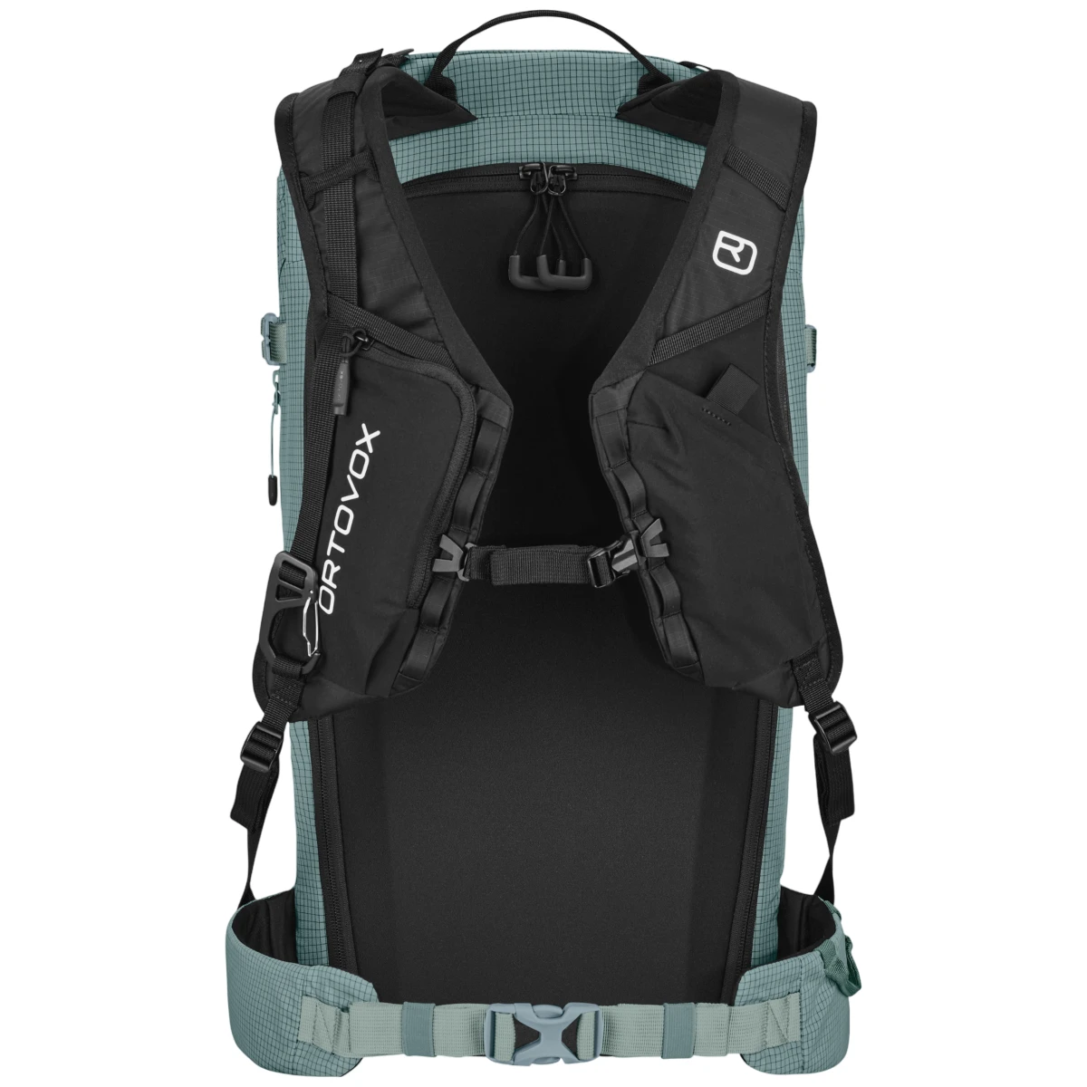 Das Hauptfach und das integrierte Sicherheitsfach mit Schaufel und Sondenhalter sind über einen Reißverschluss auf der Rückseite zugänglich. Ein großes, separates Fach bietet zusätzlichen Platz an der Oberseite des SWITCHBACK 27. Zwei Pickelhalterungen, zwei Daisy Chains, ein Seil und ein Helmnetz komplettieren die vielseitigen Befestigungsmöglichkeiten.