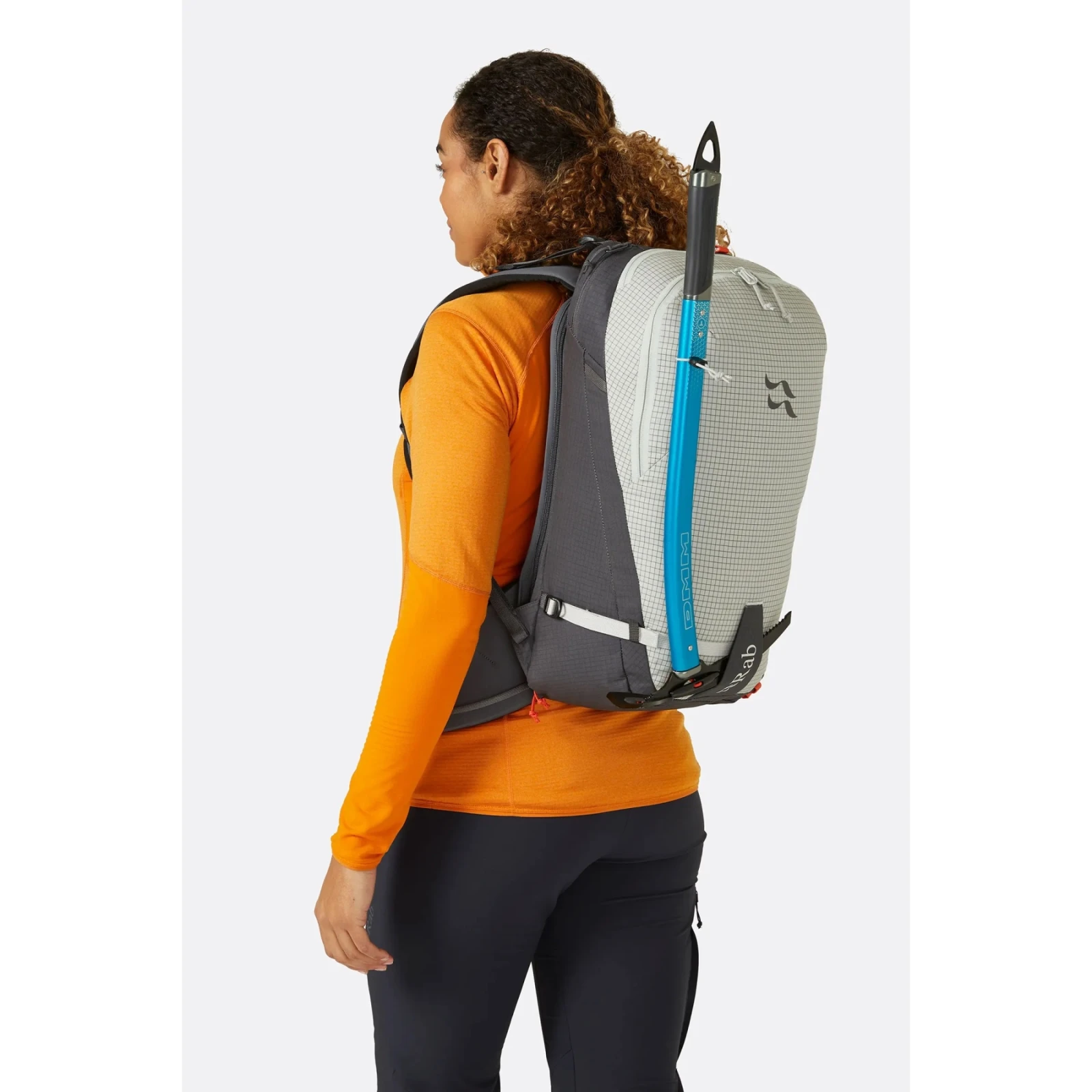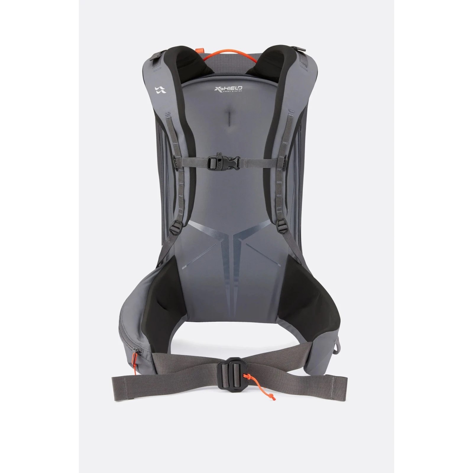 Der Rab Khroma-Rucksack ist ein leichter Ski-Alpin-Rucksack mit Heckzugang und einem Fassungsvermögen von 22 Litern. Der Rucksack besteht aus extra starkem Cordura-Gewebe, das zusätzlich mit Spectra®-Fasern verstärkt ist. Die Fasern verfügen über eine 15-mal höhere Festigkeit als Stahl bei gleichem Gewicht. Der Rucksack ist durch die wasserdichte HydroShield-Beschichtung vor Regen und Schnee geschützt und es bleibt kein Schnee an der Rückwand haften.