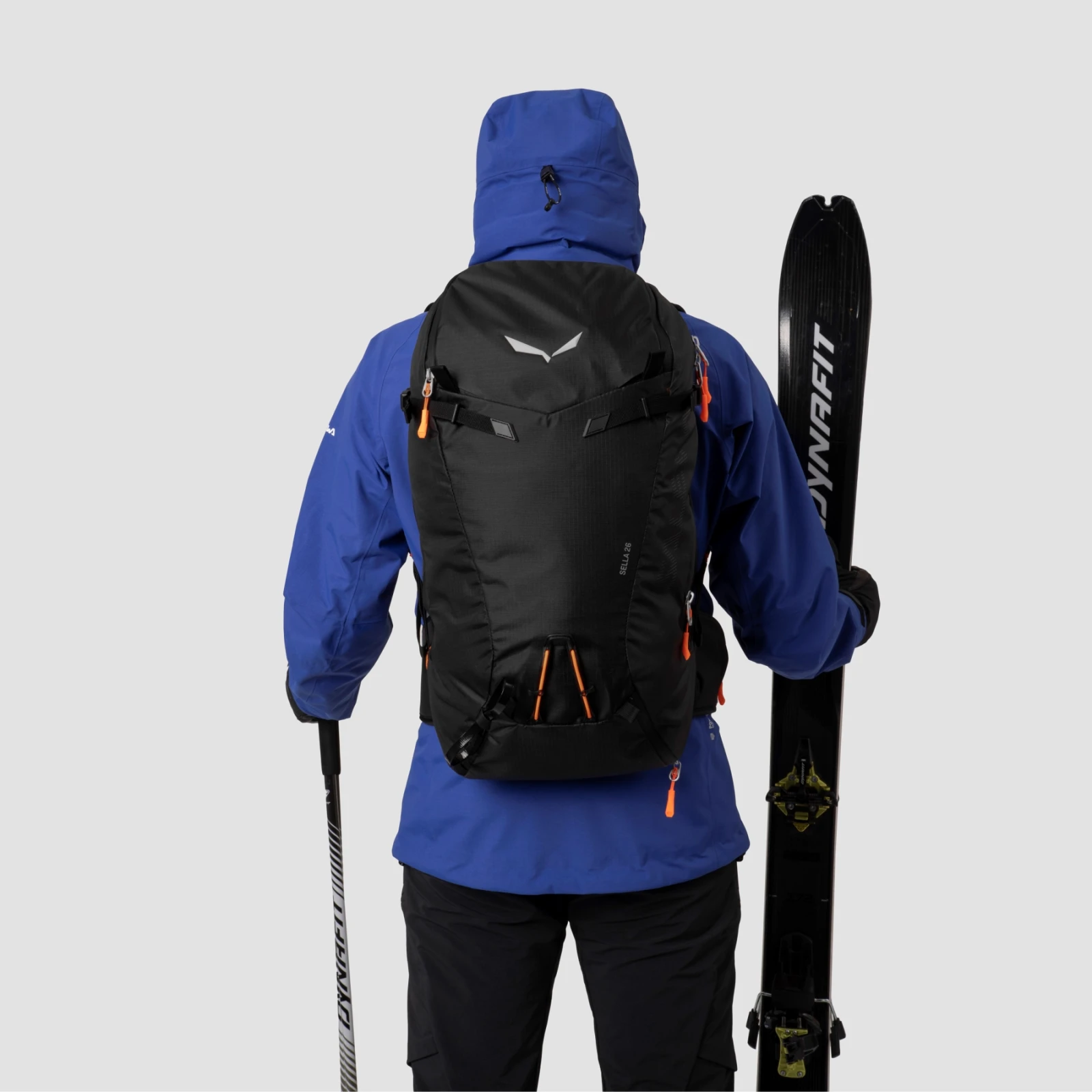 Der Sella 26L ist die perfekte Ausrüstung für alle Skifahrer und Schneeabhängigen dank eines Reißverschlusses, der über die gesamte Länge des Rucksacks verläuft, doppelten Schlaufen für Eispickel, magnetischen Schnallen, die sich leicht mit Handschuhen öffnen lassen, einer speziellen Tasche für ein Lawinenverschüttetensuchgerät und zwei Möglichkeiten zur Skibefestigung: parallel für besseren Schutz und Stabilität oder diagonal, ohne den Rucksack abzunehmen, was in steilem Gelände immer nützlich ist.