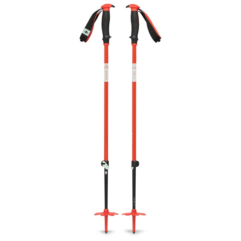 Das Verschlusssystem Dual Flick Lock ermöglicht eine einfache und schnelle Längenverstellung, sogar mit Handschuhen. Die Stöcke verfügen über ergonomische Griffe, einen Haken am Ende zur Bedienung von Ski- oder Schneeschuhbindungen sowie verlängerte Griffe für die Fortbewegung an steilen Hängen oder Querungen. Die bequem gepolsterte Schlaufe ist verstellbar und die großen Teller mit 100 mm Durchmesser verhindern das Einsinken der Stöcke im tiefen Schnee.