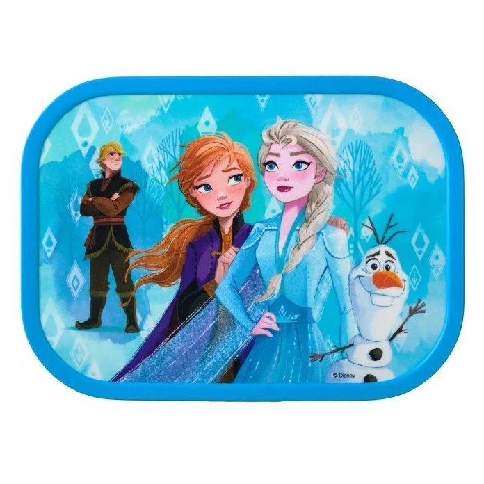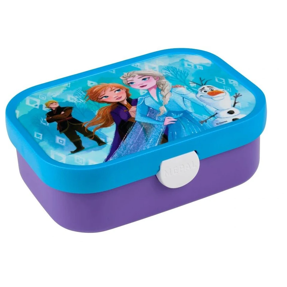 Praktische Snackbox Mepal Campus Frozen 750 ml mit Unterteilungen und einer Gabel mit Easy-Opening-Clip auch für kleinere Kinder. Kinder werden das fröhliche Design der beliebtesten Disney-Geschichten lieben. Für die Schule, unterwegs, für Snacks, Obst und Gemüse.