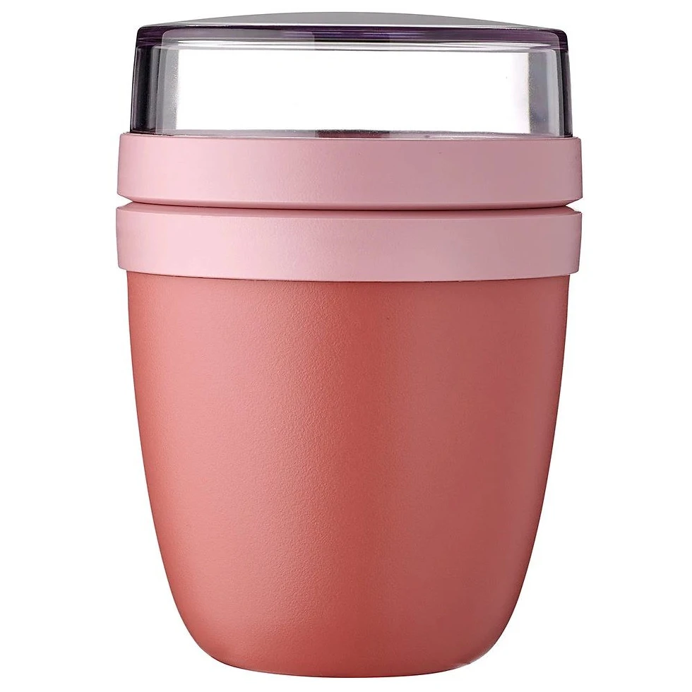 Praktische Lunchbox Mepal Ellipse Mini 300 + 120 ml mit zwei Behältern und auslaufsicherem Deckel für Arbeit, Picknick und Reisen. Der Deckel verschließt die Speisen optimal und hält sie frisch und knackig. Die Box ohne Deckel ermöglicht es, Speisen in der Mikrowelle zu erwärmen und anschließend in der Box zu servieren.