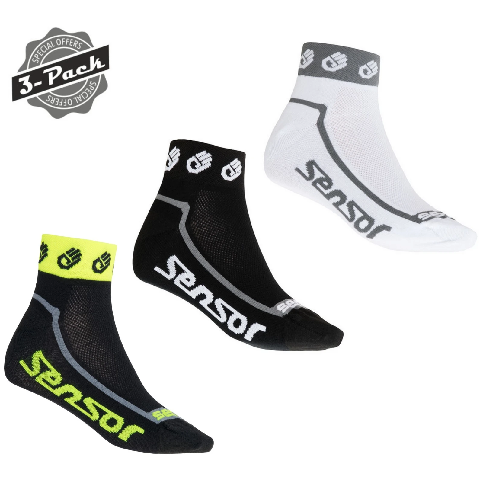 Vorteilspack Socken (3 Paar) Sensor 3er-Pack Race Lite Small Hands eignen sich zum Radfahren und Laufen. Die Socken sind ungepolstert und haben an der Unterseite ein zweilagiges Strickgewebe. Der Spann ist zur besseren Belüftung mit Mesh versehen und Ferse und Zehen sind verstärkt. Geeignet für den Radsport, aber auch für den Alltag bei warmem Wetter.