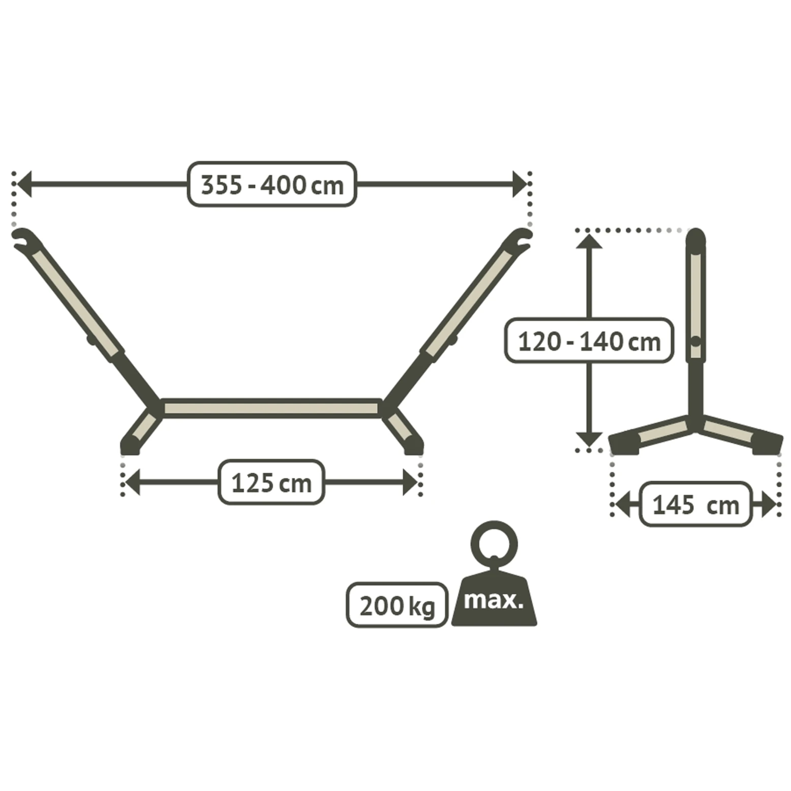 Das Nautico Hängemattengestell La Siesta bis 200kg ist ein sehr leicht zusammenklappbares Gestell, das für Hängematten La Siesta vom Typ Single konzipiert ist und bis zu 200kg belastbar ist. Der Aufbau des Ständers ist ganz einfach und für jedermann möglich. Das Gestell ist sowohl für den Innen- als auch für den Außenbereich geeignet und ermöglicht es, die Hängematte an einem Ort aufzustellen, an dem eine Befestigung sonst nicht möglich wäre, sowohl auf der Terrasse als auch in einem Garten ohne geeignete Bäume oder in der Chill-out-Zone eines Büros. Außerdem können Sie es problemlos von Ort zu Ort tragen. Die Höhe des Ständers lässt sich zwischen 120 und 140 cm verstellen und auch die Spannung des Netzes können Sie durch die Verstellung der Ständerlänge zwischen 355 und 400 cm beeinflussen.