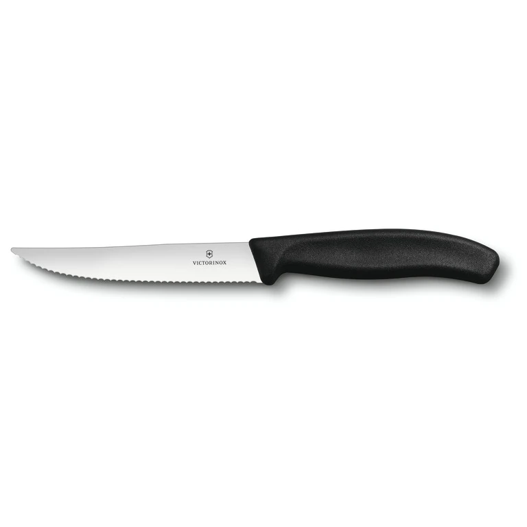 Steak- Messer der Schweizer Marke Victorinox mit gewellter Klinge, 12cm lang. Es eignet sich perfekt zum Grillen von Steaks oder zum Schneiden Ihrer Lieblingssteaks. Durch den hochwertigen Kunststoffgriff liegt das Messer gut in der Hand.