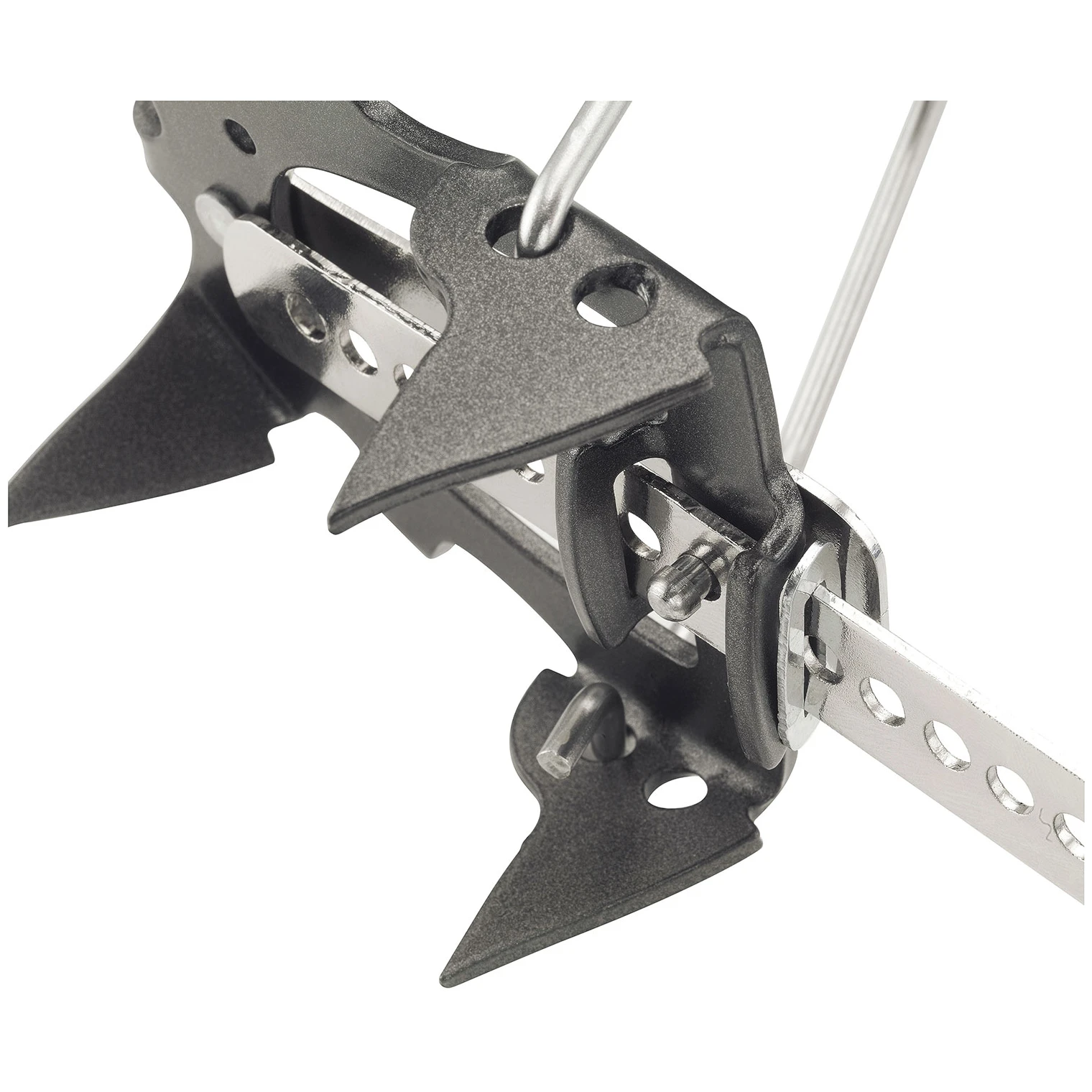 Ein großer Vorteil der Steigeisen ist die verstellbare Verbindungsbrücke, die ohne Werkzeug eine große Auswahl an Größen von 36 - 48 (EU) ermöglicht. Die thermoplastische Zehen- und Fersenbefestigung des Schuhs bleibt auch bei niedrigeren Temperaturen weich und sorgt so für eine optimale Passform am Schuh. Die Steigeisen verfügen über dynamische Schneeauswerfer, die verhindern, dass Schnee an der Schuhsohle festklebt.