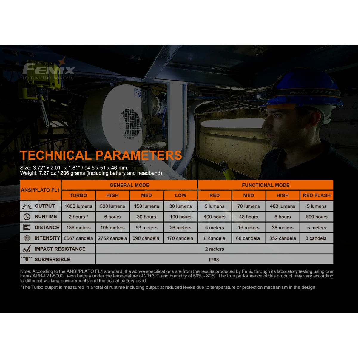 Alle Parameter der Lampe (Lichtstrom, Batteriebetriebsdauer, Wasserdichtigkeit, Nachleuchten und Stoßfestigkeit) werden gemäß dem Standard ANSI/NEMA FL 1-2009 gemessen.