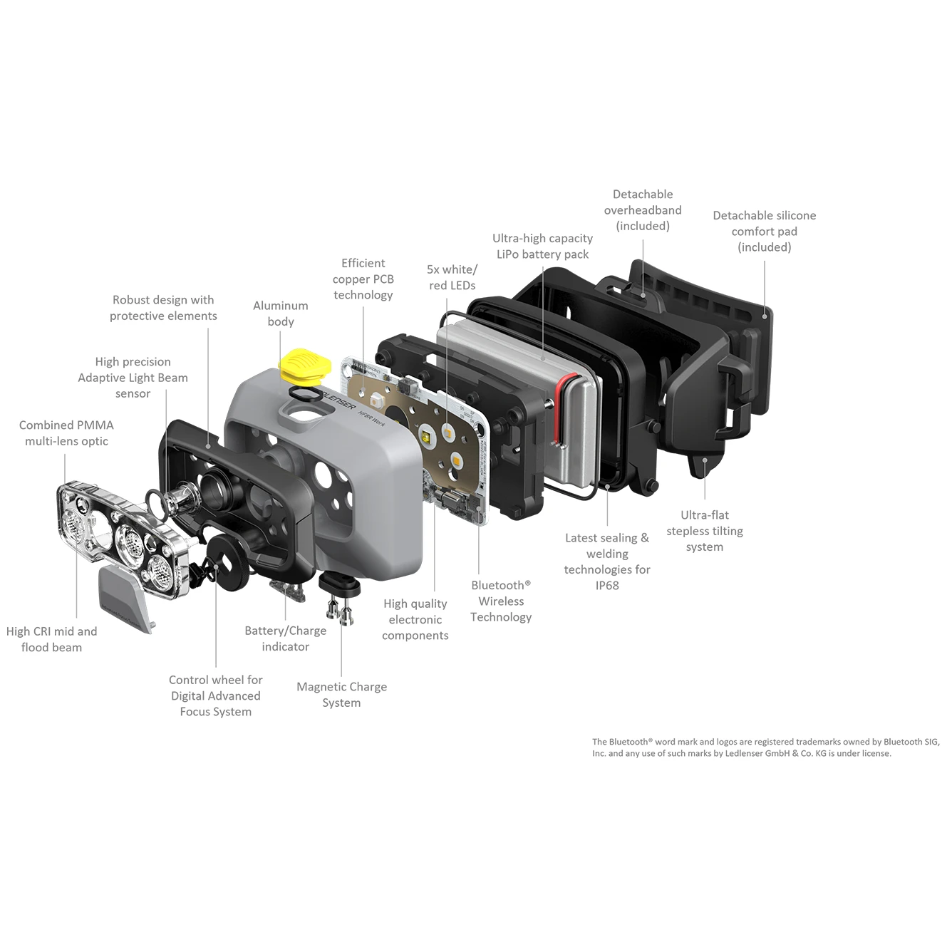 Das Vorhandensein von rotem Licht ist auch in Situationen angenehm, in denen Sie andere nicht blenden möchten. Die stufenlose Neigung des Leuchtenkopfes sorgt für Flexibilität und maximale Individualisierung. Darüber hinaus kann die Stirnlampe über die mobile Anwendung Ledlenser Connect ferngesteuert werden.