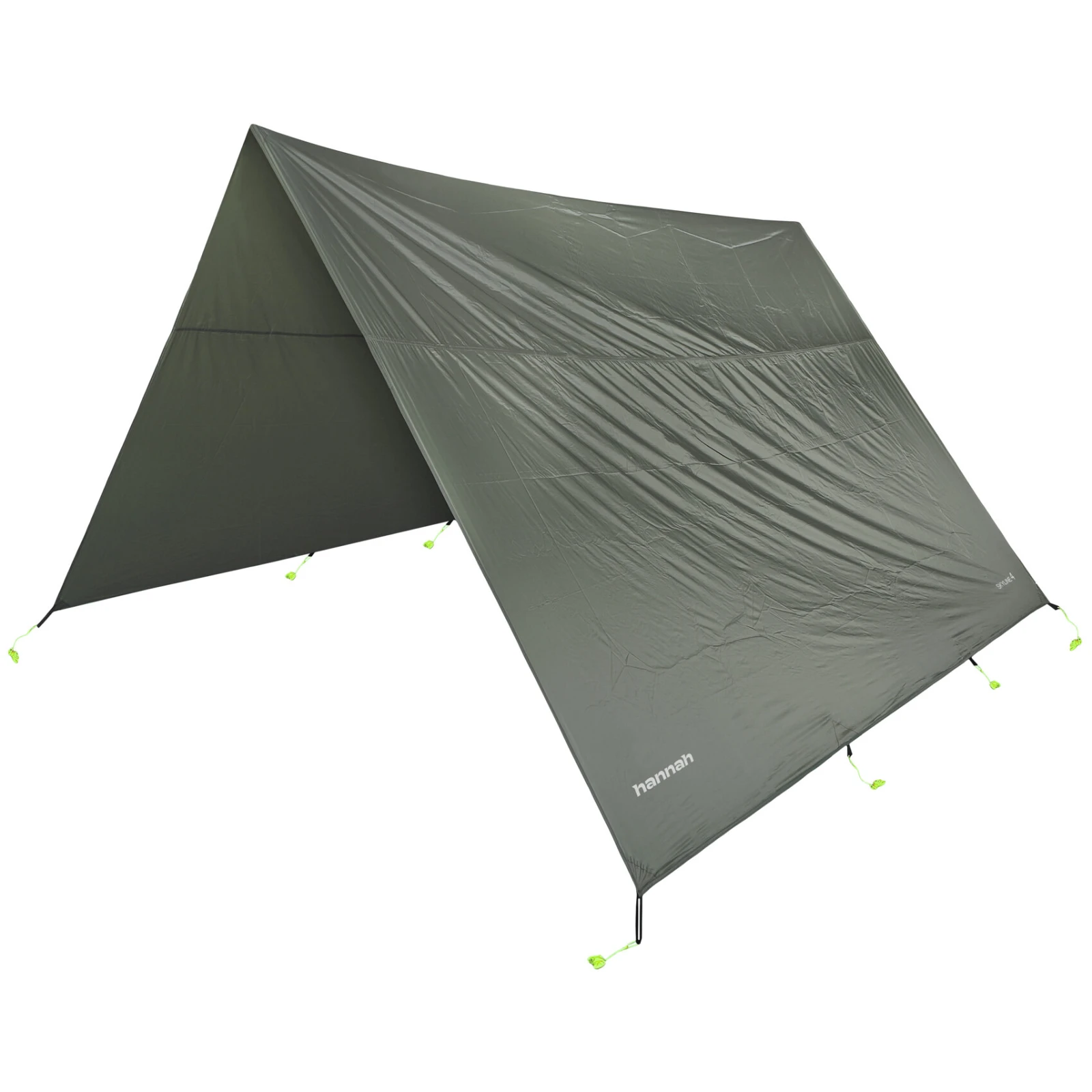 Der Unterstand Skyline 4 der Marke Hannah eignet sich zum freien Aufhängen in der Natur. Es enthält 8 Entriegelungsgurte und 2 Metallösen, die sich zur Befestigung von Trekkingstöcken (nicht im Lieferumfang enthalten) eignen. Die Größe des Unterschlupfs beträgt 440 x 350 cm und er wiegt 1,5 kg.