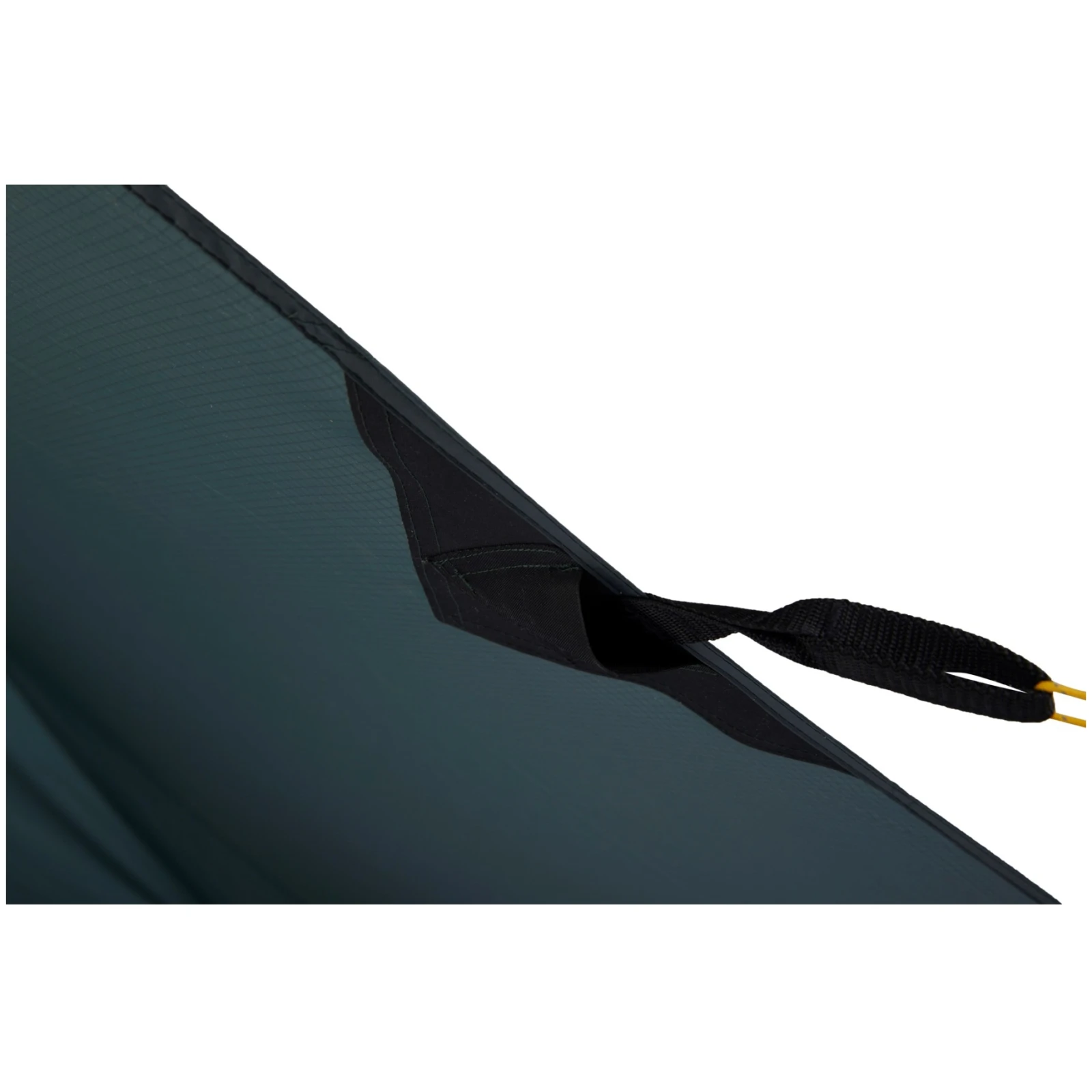 Die Voss SI Tarp -Leine ist leicht, bietet hohe Haltbarkeit und flexiblen Einsatz. Das geringe Gewicht wurde durch ein Nylon-Außenzelt mit Ripstop-Beschichtung und einer Silikonbeschichtung erreicht, das leichter, stärker und abriebfester als Polyester ist. Durch die quadratische Form ergeben sich vielfältige Baumöglichkeiten je nach Standort und Witterung. Jedes Blatt verfügt über mehrere Befestigungspunkte, die an den Rändern verstärkt sind. Das Zelt hat eine Wassersäule von 3000 mm.