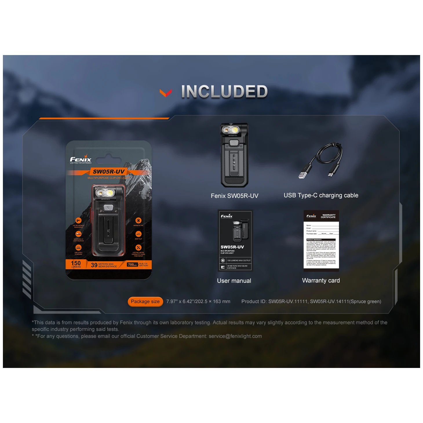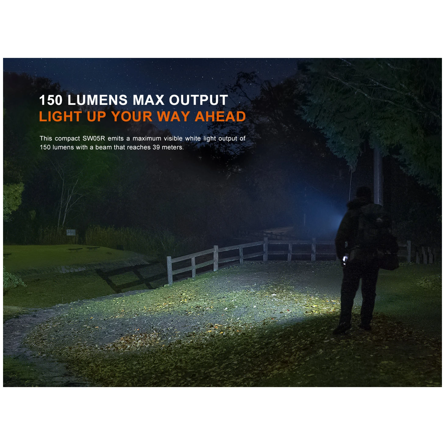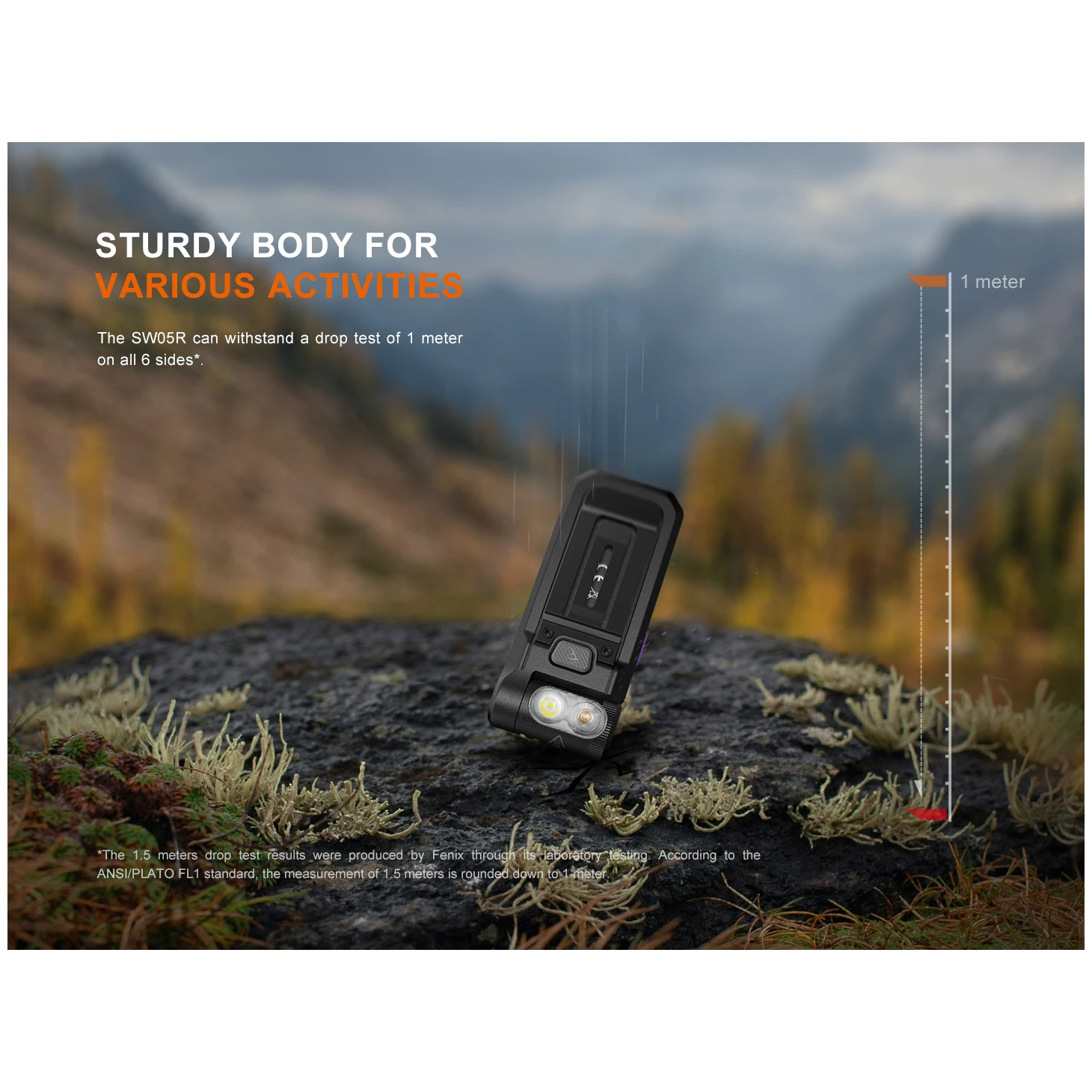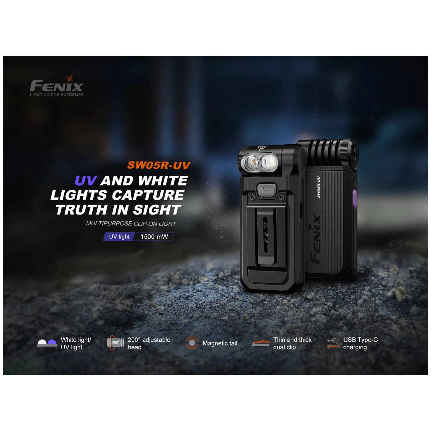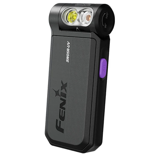 Die Fenix SW05R-UV ist eine praktische und leistungsstarke Taschenlampe, auf die Sie sich bei der Arbeit und in der Freizeit verlassen können. Dank ihrer kompakten Größe und des geringen Gewichts von nur 55 Gramm lässt sie sich leicht in einer Tasche oder einem Rucksack verstauen. Ihr drehbarer Kopf ermöglicht die Einstellung des Lichtstrahls in einem Bereich von 200 Grad, sodass Sie sie an Ihre aktuellen Bedürfnisse anpassen können.