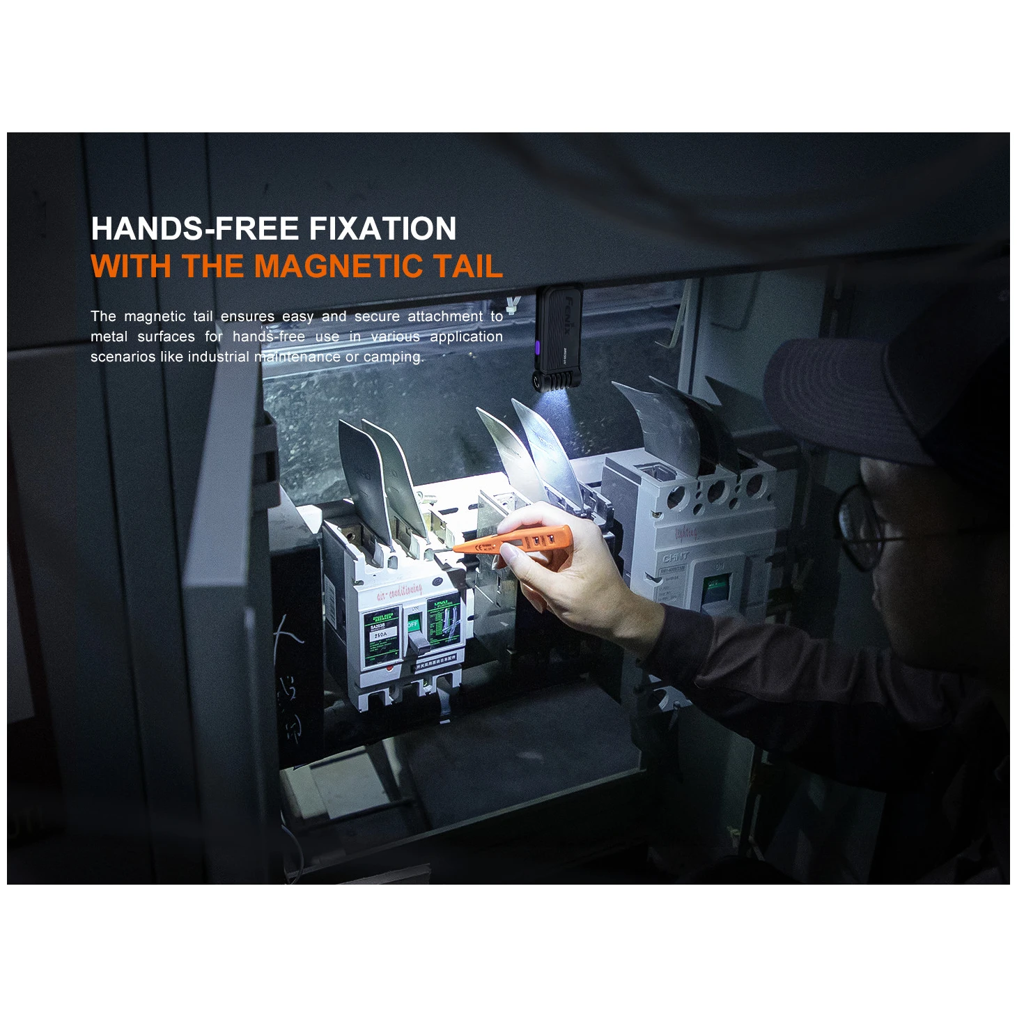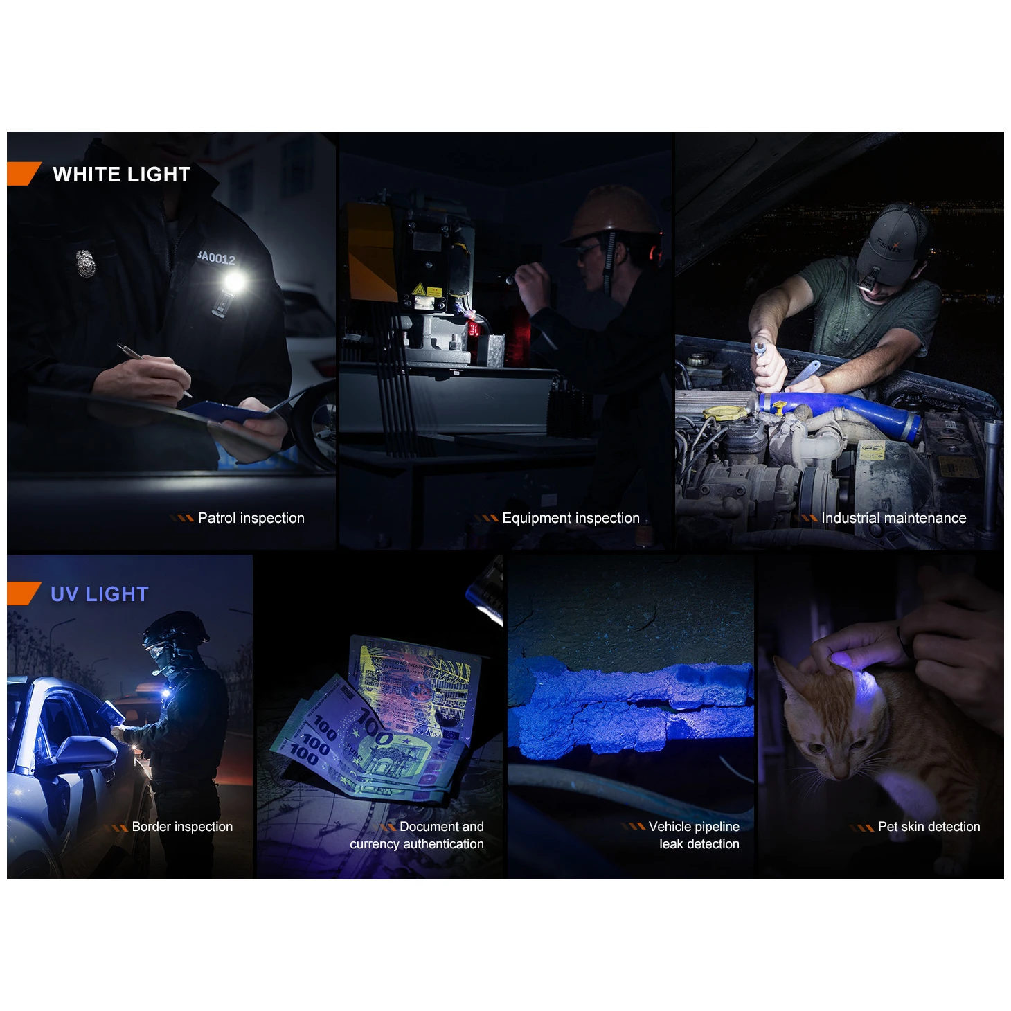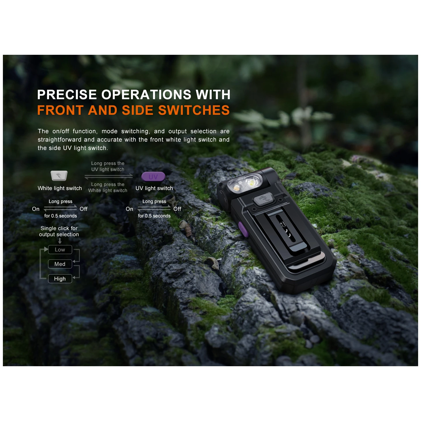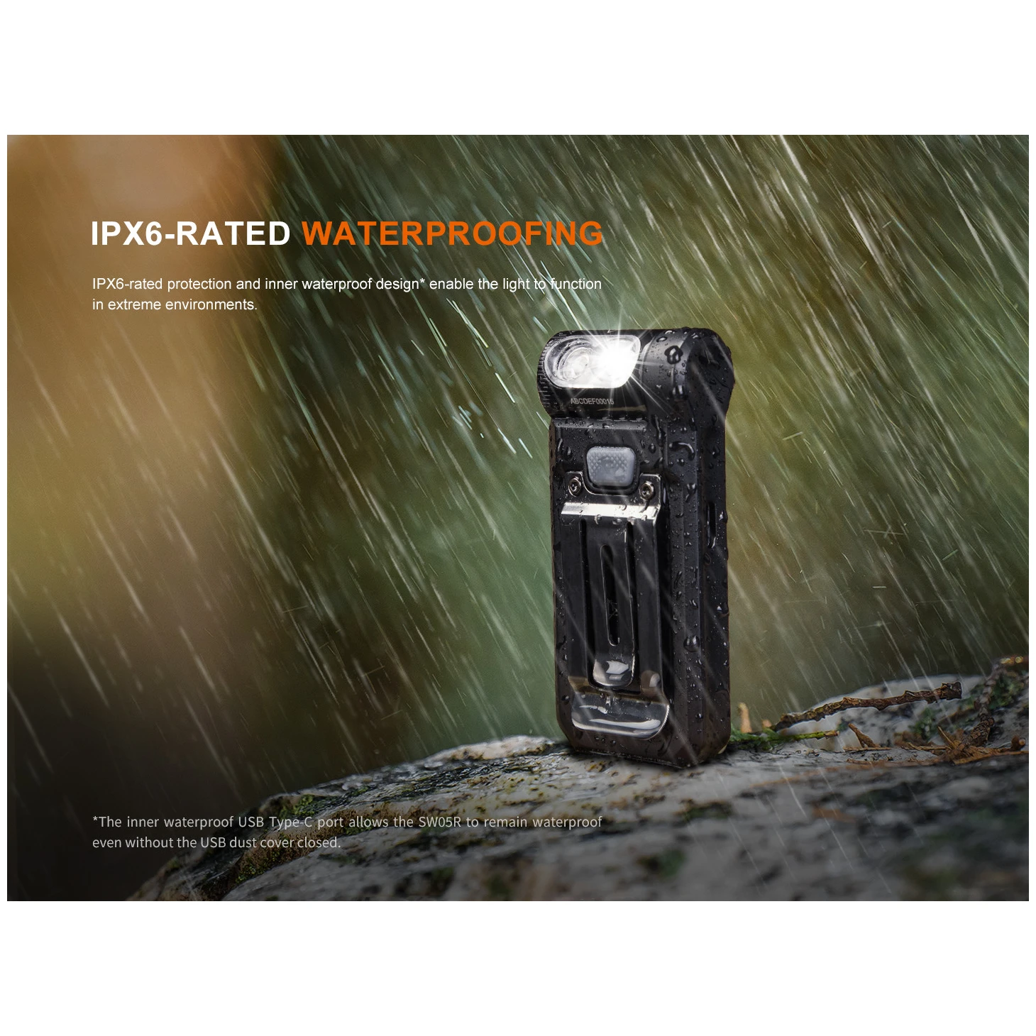 Die Fenix SW05R-UV ist eine praktische und leistungsstarke Taschenlampe, auf die Sie sich bei der Arbeit und in der Freizeit verlassen können. Dank ihrer kompakten Größe und des geringen Gewichts von nur 55 Gramm lässt sie sich leicht in einer Tasche oder einem Rucksack verstauen. Ihr drehbarer Kopf ermöglicht die Einstellung des Lichtstrahls in einem Bereich von 200 Grad, sodass Sie sie an Ihre aktuellen Bedürfnisse anpassen können.