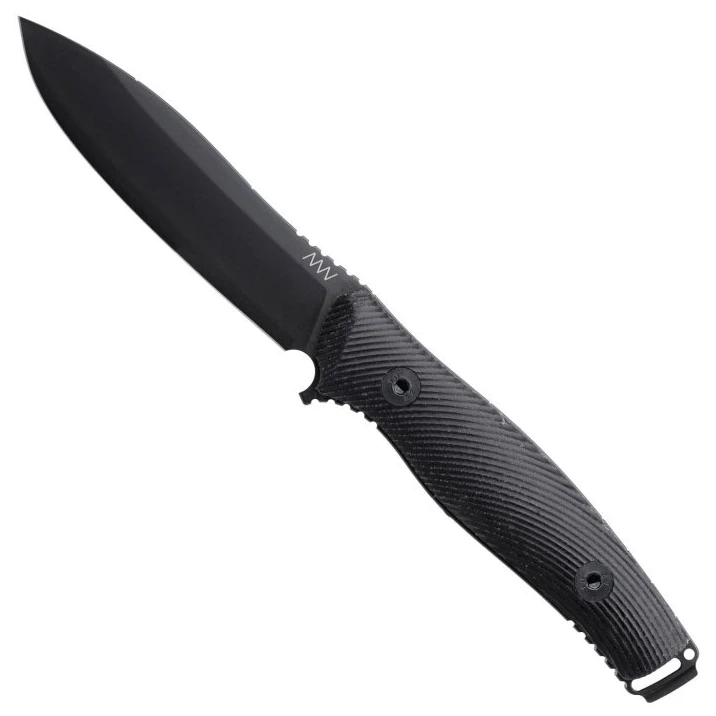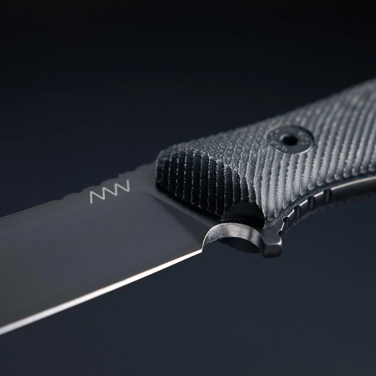 Die Messerklinge besteht aus hochlegiertem SleipnerStahl, der durch eine langlebige DLCOberflächenveredelung ergänzt wird. Für einen sicheren Halt in jeder Situation sorgt der ergonomische Micarta-Griff, der präzise aus einem Block gefräst ist. Die feste Verbindung zwischen Griff und Klinge wird durch Edelstahlschrauben gewährleistet, welche in massiven Gewindebuchsen sitzen. Die Klinge ist mit einer geschärften Schneide ausgestattet, die den Einsatz von Feuerstahl ermöglicht. Das Griffende ist dann mit einer RBS-System-Schlägersicherungausgestattet, man kann damit aber auch bequem ein Bier öffnen.