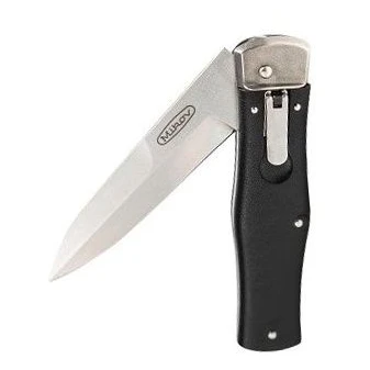 Auswerfermesser Marke Mikov 241-BH-1/STKP mit einer Klingenlänge von 9,5 cm und einer Breite von 23 mm. Sein komplettes Innenleben ist aus hochwertigem Edelstahl gefertigt, ergänzt durch einen schwarzen Griff. Dieses Messer ist für jeden Camper, Pfadfinder oder Reisenden geeignet, da es kompakt, leicht und einfach zu tragen ist.