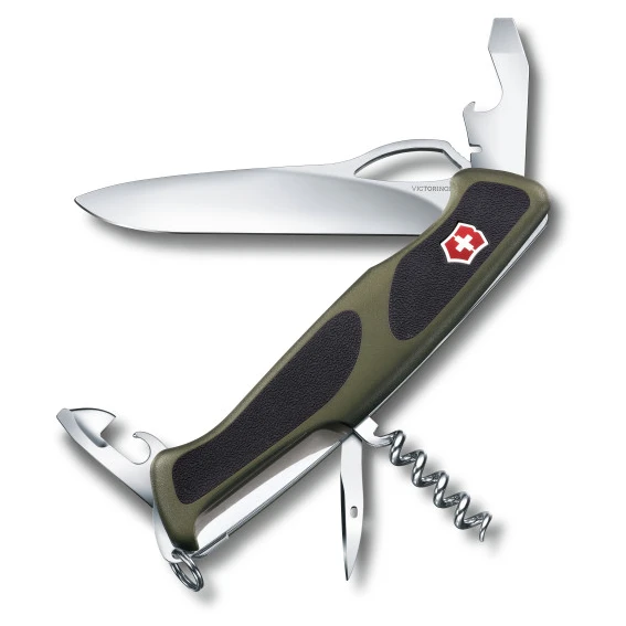 Das Klappmesser Victorinox RangerGrip 61 aus der Délemont-Serie ist dank seiner Länge von 130 mm und insgesamt 11 Funktionen ein ideales Werkzeug für jede Situation. Die große Klinge mit glatter Edelstahlschneide lässt sich dank Öse einhändig öffnen. Eine raffiniert versteckte Sicherheitssperre im Schweizer Kreuz-Emblem sorgt dafür, dass das Messer nicht unbeabsichtigt zufällt. Alle Werkzeuge sind in einem ergonomisch geformten Kunststoffgriff mit Gummibeschichtung untergebracht, um ein Abrutschen des Messers zu verhindern.