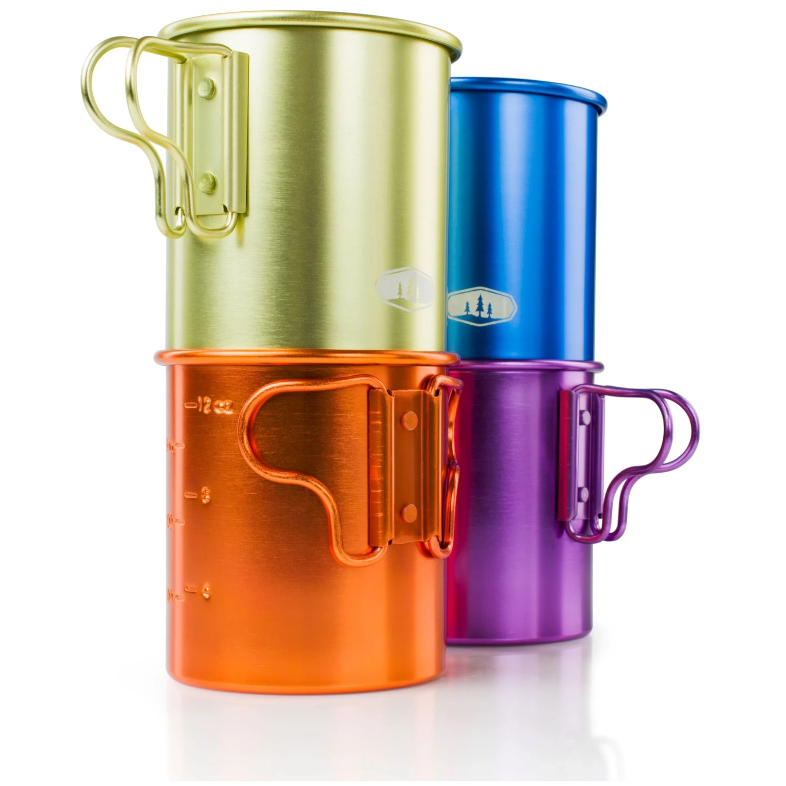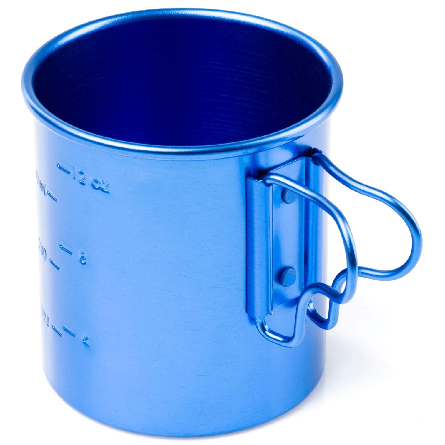 Der leichte, langlebige Becher mit einem Fassungsvermögen von 414 ml, der Bugaboo 14 Cup der Marke GSI Outdoors, ist aus eloxiertem Aluminium gefertigt. An der Wandung befindet sich eine gut lesbare Messlinie. Der praktische zweiteilige Tragegriff lässt sich ganz einfach zusammenklappen und spart so zusätzlich Platz.