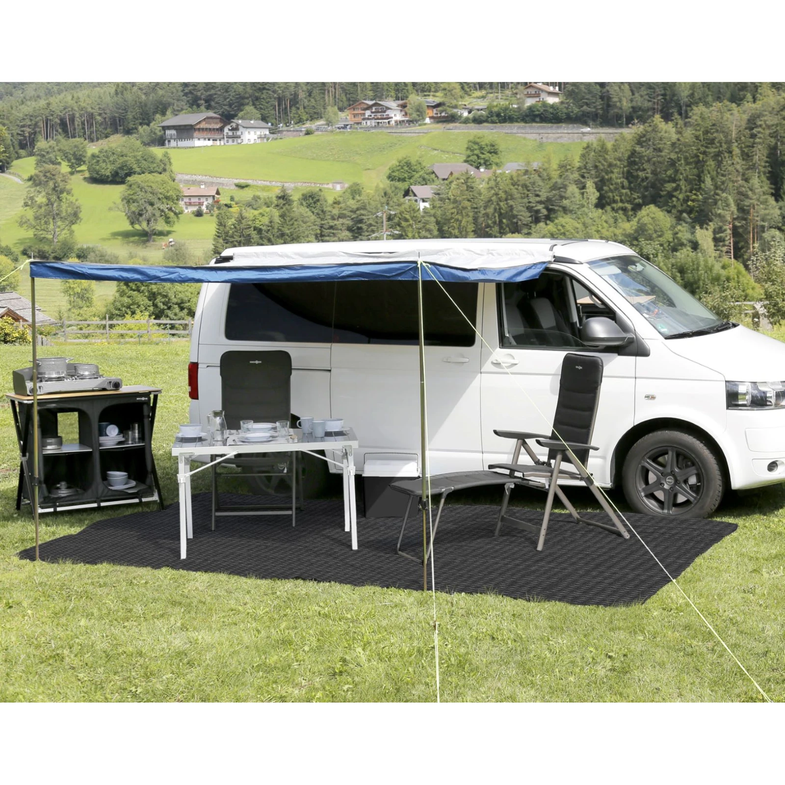 Der leichte Markisenteppich Balmat 250x700 cm der Marke Brunner ist ideal für kleinere Caravans und Wohnmobile. Der Teppich ist beidseitig nutzbar, lässt sich leicht reinigen und ist reißfest. Darüber hinaus ist es wasserundurchlässig, atmungsaktiv, UV-beständig und recycelbar.