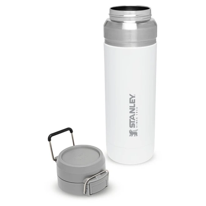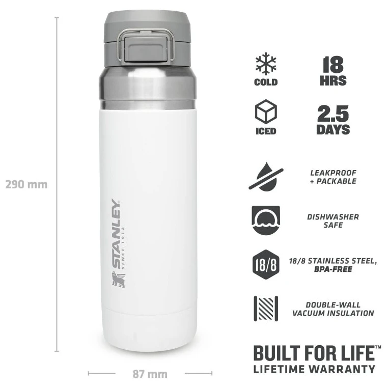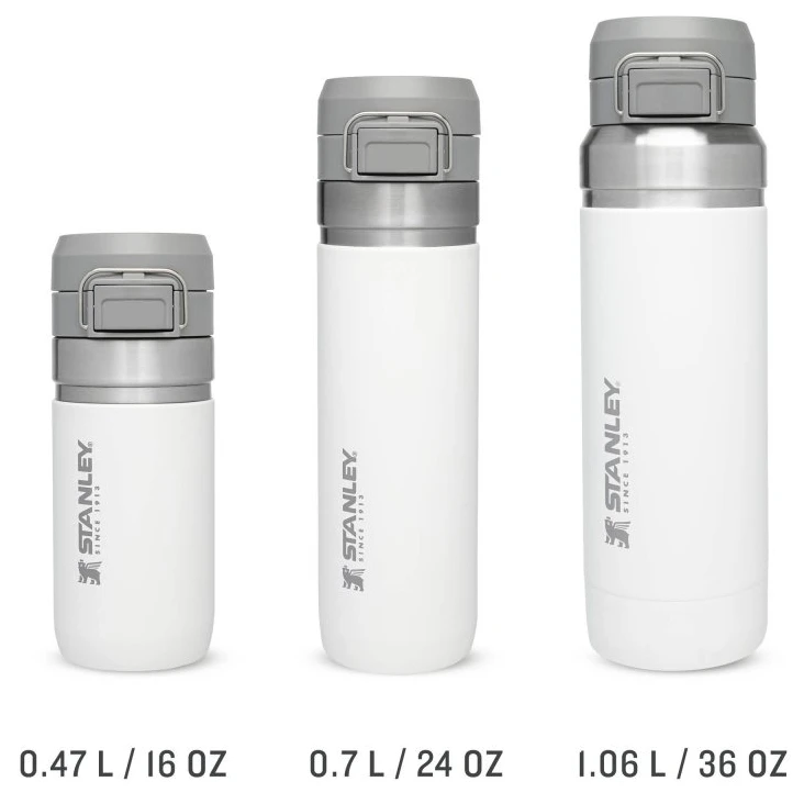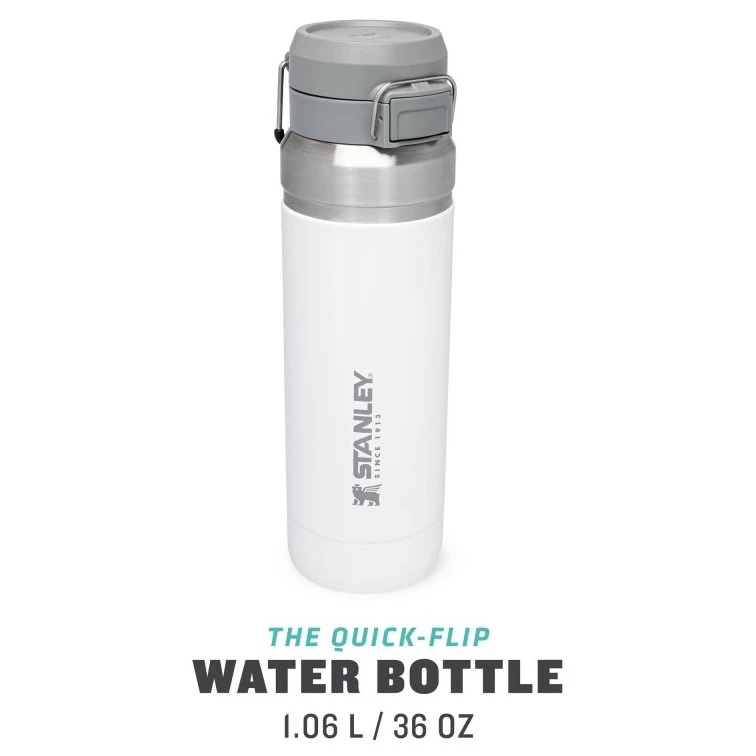 Thermosflasche Stanley Quick Flip, 1060 ml Fassungsvermögen, für Auto, Outdoor, Sport. Praktische Größe für eine Person, auch für längere Reisen, hervorragendes Verhältnis von Größe zu Volumen. Metallschlaufe zum Tragen oder Befestigen am Rucksack. Große Öffnung zum Reinigen, aber auch zum Einwerfen von Eiswürfeln oder Früchten. BPA-frei, geprüft in der EU, pulverbeschichtete Oberfläche, 18/8 Edelstahl sorgt für Langlebigkeit, Vakuumisolierung bietet höchste Hitzebeständigkeit. Sie müssen keine Angst mehr haben, dass etwas aus der Flasche ausläuft. Sie müssen sich lediglich um die Auswahl einer Farbe kümmern. Unschlagbare 25-Jahres-Garantie von STANLEY auf angegebene Funktionsparameter seit 1913.