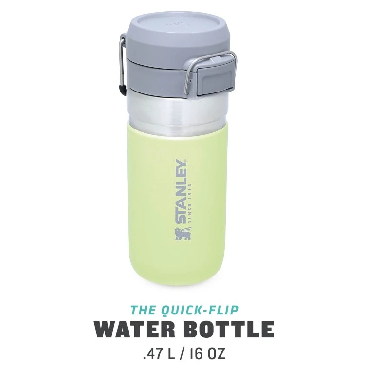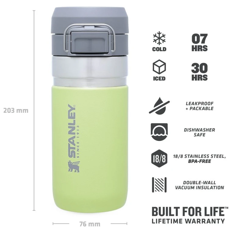Quick Flip Thermosflasche der Firma Stanley für unterwegs mit einem Fassungsvermögen von 470 ml. Praktische Einzelgröße und ein hervorragendes Größen-Volumen-Verhältnis. Metallschlaufe zum Tragen oder Befestigen am Rucksack. Große Öffnung zum Reinigen, aber auch zum Einwerfen von Eiswürfeln oder Früchten. BPA-frei, getestet in der EU, die Oberfläche ist pulverbeschichtet, 18/8 Edelstahl sorgt für Langlebigkeit, die Vakuumisolierung bietet höchste Hitzebeständigkeit. Im Auto, unterwegs, im Rucksack, in der Tasche, im Koffer, im Büro, auf der Terrasse... Sie müssen keine Angst haben, dass etwas aus der Flasche ausläuft. Sie müssen sich lediglich um die Auswahl einer Farbe kümmern. Unschlagbare STANLEY-Garantie von 25 Jahren auf angegebene Funktionsparameter, STANLEY seit 1913.