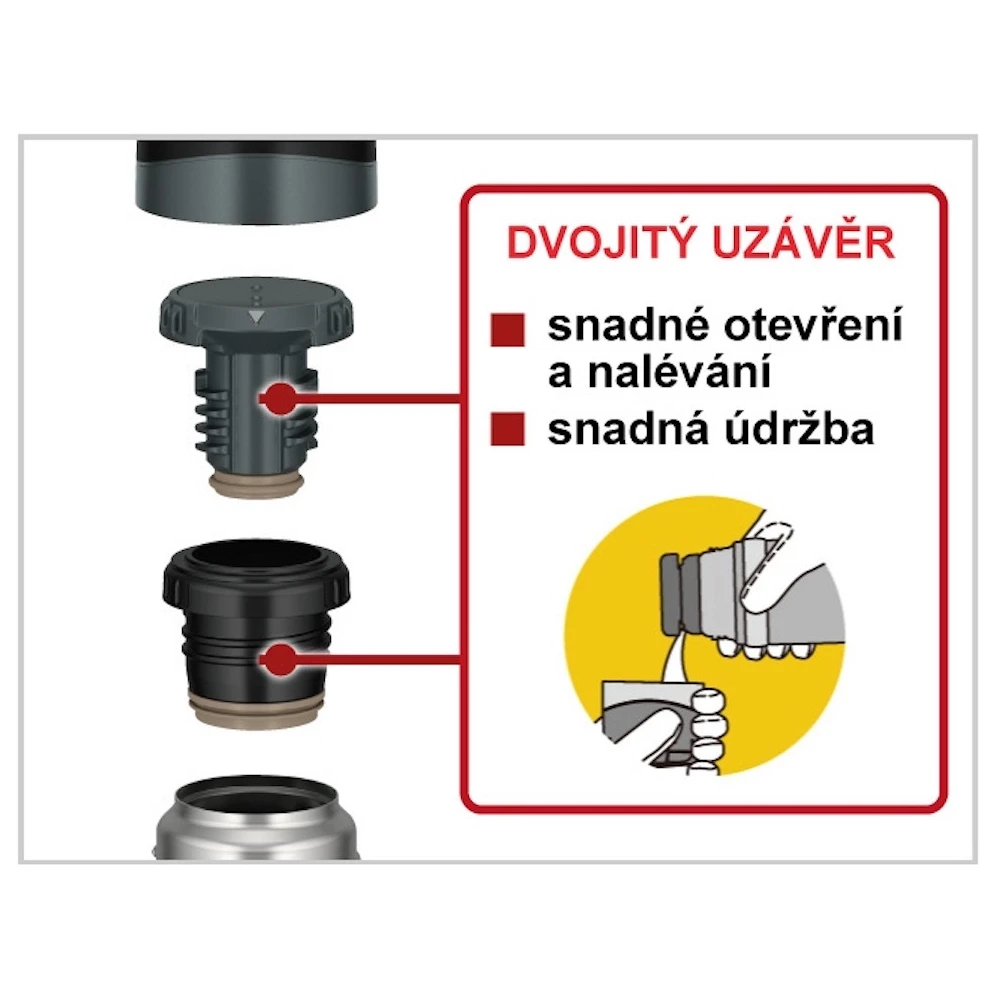 Die Besonderheit der Thermoskanne liegt in ihrem schmalen Hals mit einem Durchmesser von 36 mm mit einem speziellen Doppelverschluss, der einen gleichmäßigen Ausfluss des Getränks gewährleistet und das Öffnen und Schließen erleichtert (eine halbe Drehung genügt und Sie können ausschenken). Im Lieferumfang ist außerdem ein praktischer Lochbecher enthalten, der aus zwei Materialien unterschiedlicher Härte besteht und so ein Verrutschen beim Öffnen der Thermoskanne verhindert. Der breite Boden der Tasse sorgt für einen sicheren Stand und ermöglicht ein bequemes Greifen. Am Korpus der Thermoskanne finden wir zudem einen Anti-Rutsch-Ring, der das Öffnen auch mit dicken Handschuhen erleichtert und gleichzeitig als Schutz dient, ebenso wie ein Schutzfuß an der Unterseite.