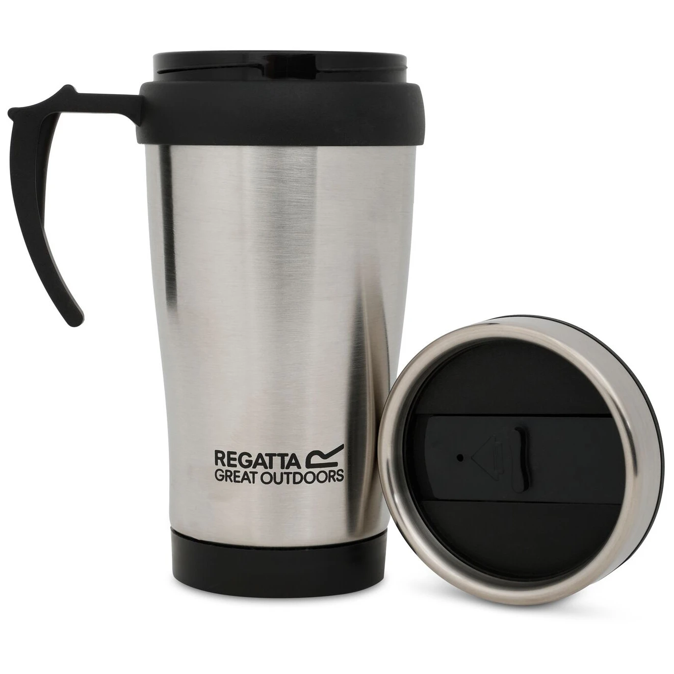 Der praktische Thermobecher Insulated Mug 0.45L von Regatta ist aus einer Kombination von Edelstahl und Kunststoff gefertigt. Hält Getränke zuverlässig mehrere Stunden lang kalt oder warm. Die Edelstahloberfläche ist sehr widerstandsfähig, pflegeleicht und der Thermobecher liegt dank des praktischen Griffs gut in der Hand. Der Deckel ist absolut dicht. Die Materialien sind BPA-frei.