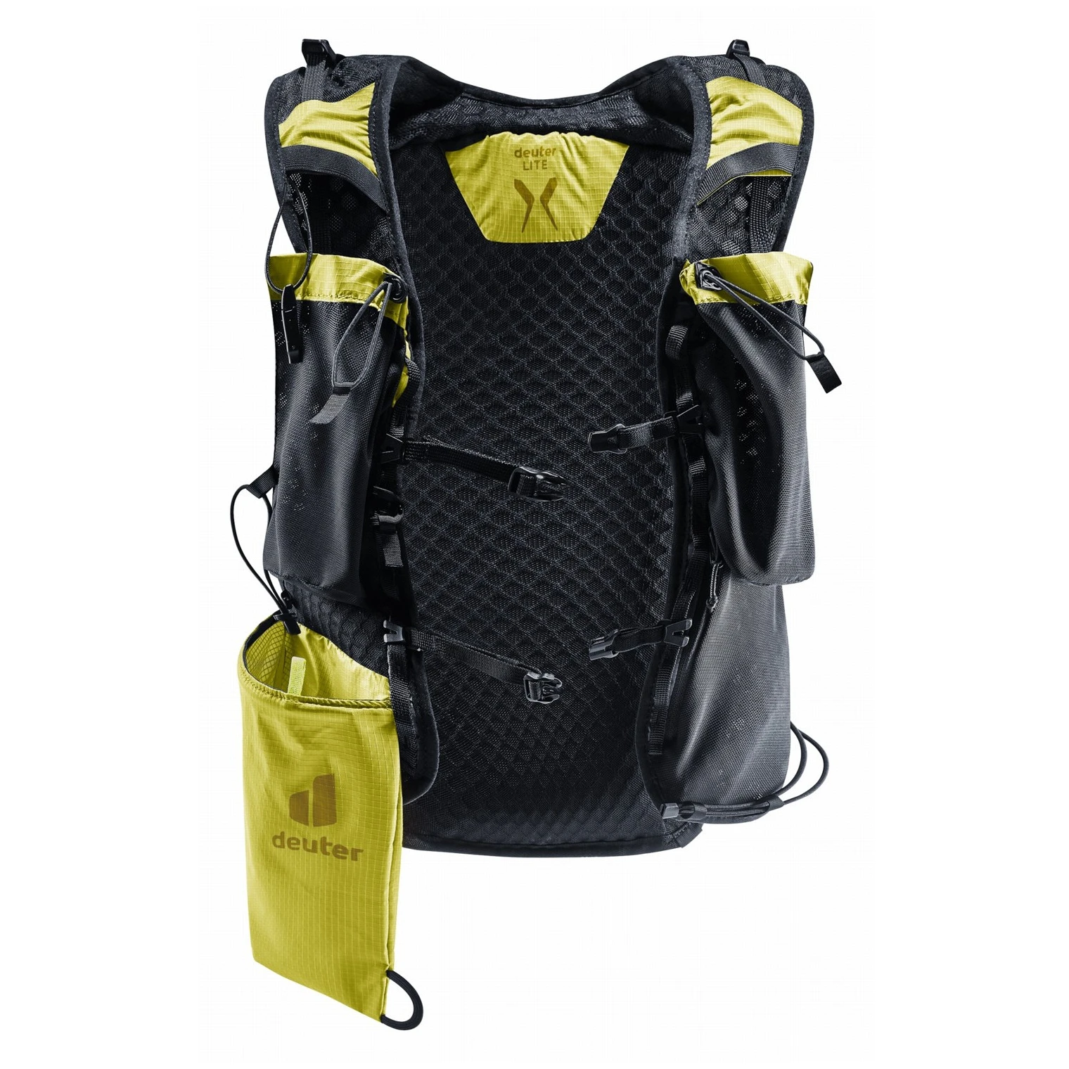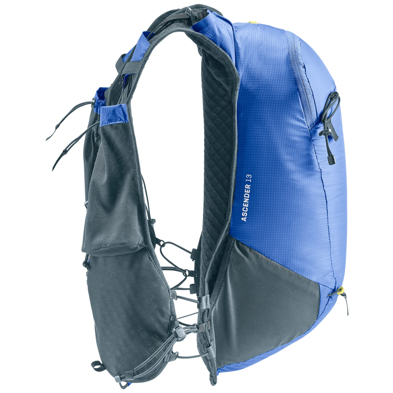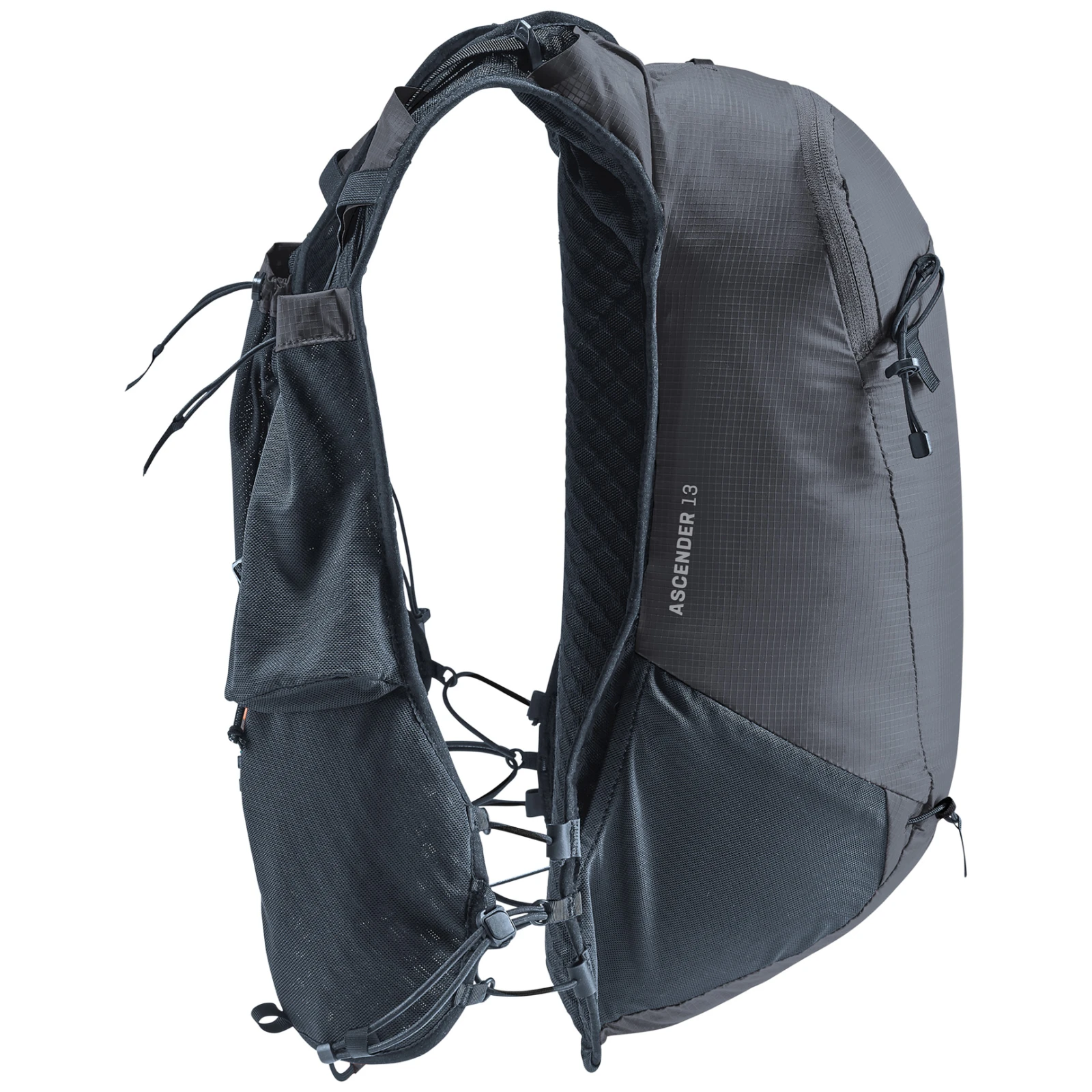 Der ultraleichte und äußerst komfortable Laufrucksack Ascender 13 der Marke Deuter verfügt über breite, ergonomische Schultergurte im Stil einer Laufweste mit elastischem Kompressionssystem. Zwei verstellbare Brustgurte und weiches Material auf der Rückseite passen sich Ihrem Körper im Handumdrehen an. Eine interne Stretch-Netztasche und seitliche Kompressionsriemen erhöhen den Komfort beim Laufen zusätzlich. Eine Tasche an der Vorderseite eines Schultergurts ermöglicht schnellen und einfachen Zugriff auf zusammenklappbare Trekkingstöcke. In den Schultergurttaschen ist Platz für Softdrinkflaschen oder ein GPS. Der Rucksackstoff besteht aus 100 % recyceltem Material und ist bluesign®-zertifiziert.
