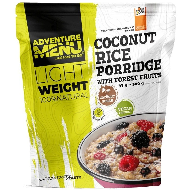 Eine großzügige Portion Brombeeren, Himbeeren und Johannisbeeren kombiniert mit Kokosblütenzucker gibt Ihnen zuverlässig Energie vor jedem Outdoor-Abenteuer. Ein reichhaltiges Frühstück vor einem Abenteuer in der Natur ist ein Muss! Veganer Reis-Kokos-Porridge mit Waldfrüchten vom Hersteller Adventure Menu LIGHTWEIGHT ist eine ideale Wahl für unterwegs. Der Porridge enthält keine künstlichen Süßstoffe, lediglich Ahornsirup oder Kokosblütenzucker. Für eine weichere und cremigere Konsistenz wird der Reis direkt in Milch gekocht.