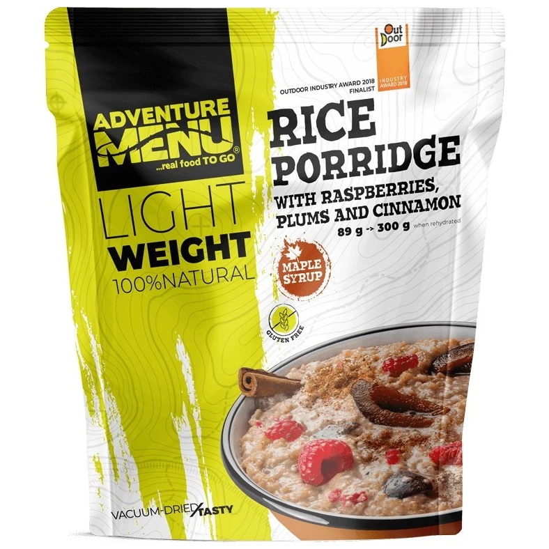 Ein reichhaltiges Frühstück vor einem Abenteuer in der Natur ist ein Muss! Reisbrei mit Pflaume, Himbeere und Zimt vom Hersteller Adventure Menu LEICHTGEWICHTIG mit einer Kombination aus süß und sauer, plus einer angenehmen würzigen Note, versetzt dich in die richtige Stimmung für jedes Abenteuer. Der Porridge enthält keine künstlichen Süßstoffe, lediglich Ahornsirup oder Kokosblütenzucker. Arborio-Reis wird direkt in Milch gekocht, um eine weichere und cremigere Konsistenz zu erhalten.