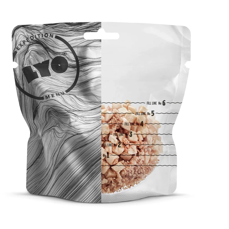 Bei der Lyophilisierung, also der Gefriertrocknung, behalten alle zu 100 % natürlichen Rohstoffe ihre ursprüngliche Form und Gestalt und somit auch ihre gesundheitsfördernden Inhaltsstoffe und Vitamine. Dank des geringen Gewichts der gesamten Tasche mit Essen kannst du diese bequem transportieren und sie belastet dein Gepäck nicht unnötig. Das Futter enthält außerdem keine künstlichen Zutaten, Farb- oder Geschmacksstoffe. Das Unternehmen verfügt zudem über eigene Plantagen und stellt den Großteil seiner Produkte aus eigenen Ernten her. Der Beutel ist hermetisch verschlossen, so dass die Lebensmittel leicht aufzubewahren sind und lange haltbar sind. Nach dem Abreißen des oberen Teils der Verpackung wird der Beutel zu einem Behälter, aus dem Sie das fertige Essen nach dem Übergießen mit heißem Wasser sofort verzehren können.