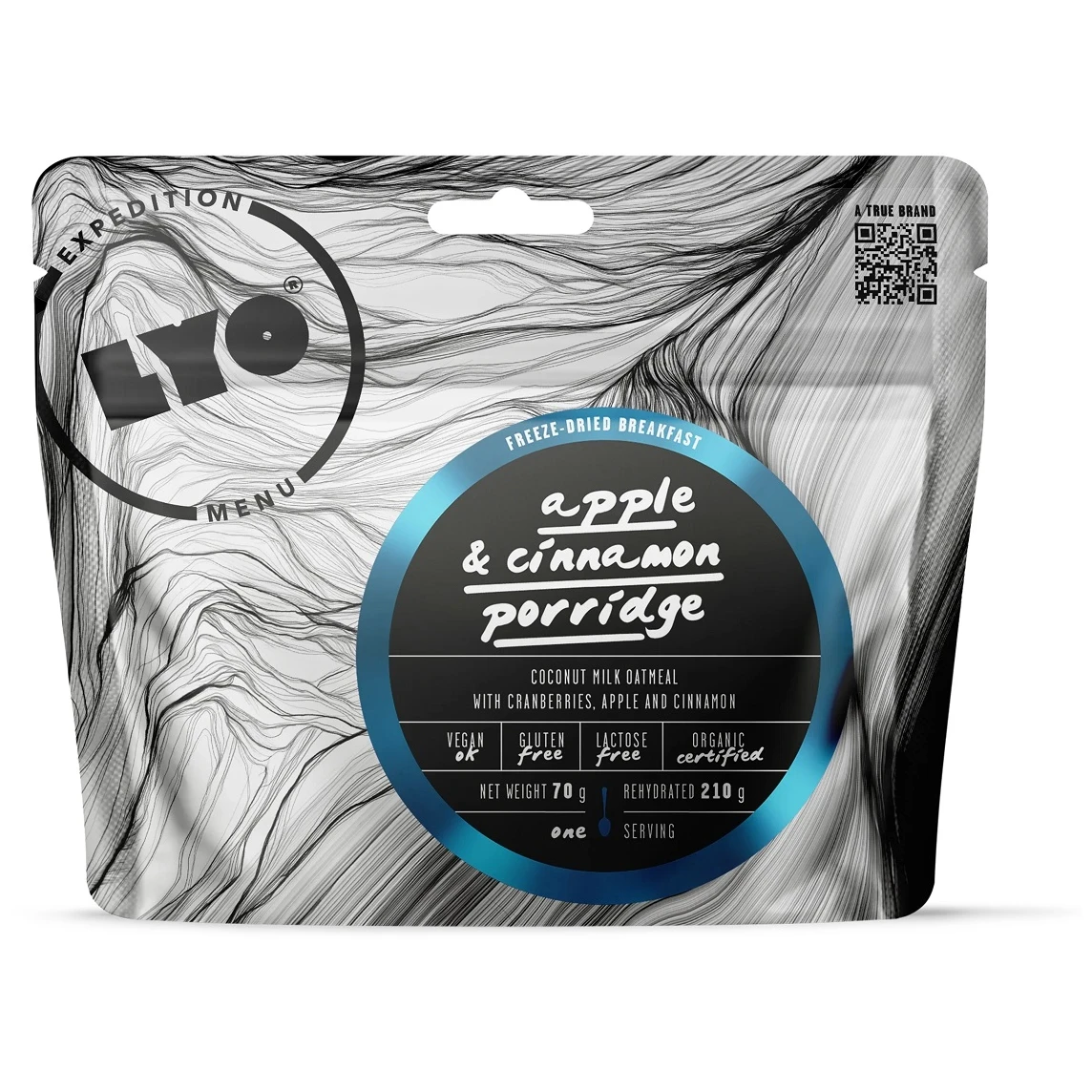 Gefriergetrocknetes Frühstück aus 100 % natürlichen Zutaten Lyo food mit dem Geschmack von Haferflocken mit Äpfeln, Preiselbeeren, Zimt und Chia ist für Vegetarier und Veganer geeignet.