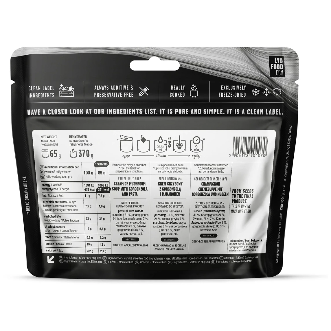 Das polnische Unternehmen Lyo Food beliefert Geschäfte mit hochwertiger gefriergetrockneter Nahrung seit 1998. Die Idee ist, Bergsteiger, Wanderer, Segler, Extremsportler oder Reisende mit einer hochwertigen Nahrung zu versorgen, die mit allen wichtigen Makronährstoffen vollgepackt ist. Im Jahr 2013 erhielt Lyo Foods den Gold Award bei den Industry Awards, eine der renommiertesten Auszeichnungen, die nur an Produkte von höchster Qualität mit einer innovativen Idee vergeben wird. Die Speisen von Lyo Foods sind zu 100 % aus frischen und natürlichen Zutaten gemacht, von denen das Unternehmen einige für sich selbst anbaut.
