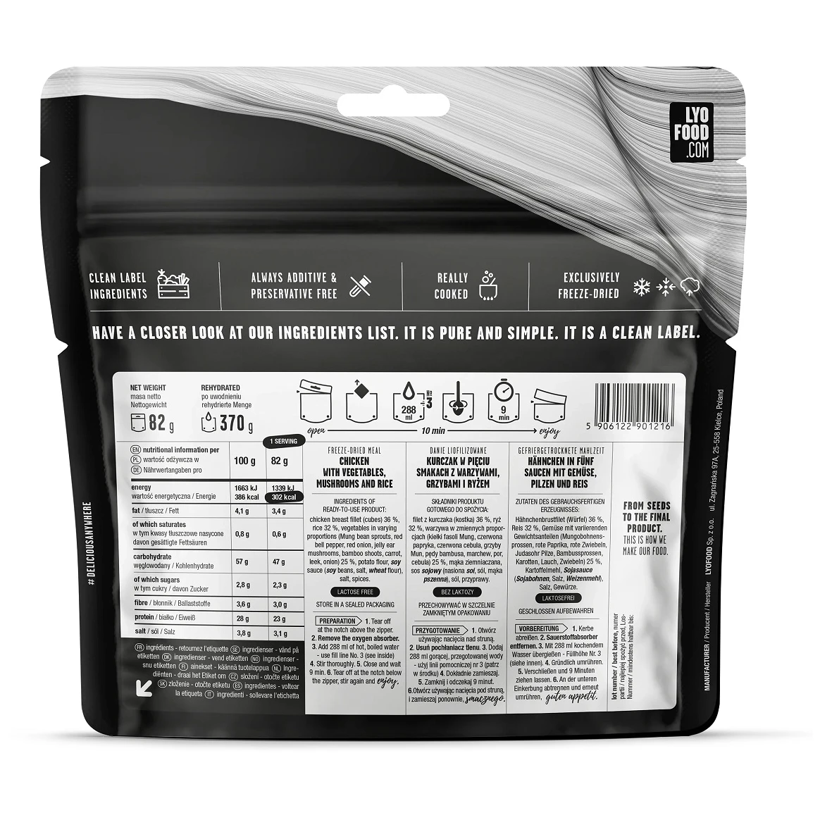 Hochwertiges Futter Lyo food Fünf-Geschmacks-Huhn mit Reis in der Gewichtsklasse 370 g ist ideal für Expeditionen, Reisen, Streifzüge ins Unbekannte, aber auch zum Angeln, Segeln, Seekajakfahren, einfach überall, wo das Gewicht eine Rolle spielt. Das von Lyo Food gekochte Hühnchen mit fünf Geschmacksrichtungen und Reis ist ein sehr hochwertiges verarbeitetes Lebensmittel. Es ist in einer speziellen Aluminiumverpackung verpackt, die vor Feuchtigkeit und Temperatur schützt. Daher verliert das Lebensmittel weder Nährwert noch Aroma und Geschmack und ist zum sofortigen Verzehr bereit. Für die Speisen werden ausschließlich 100 % natürliche und frische Zutaten verwendet. Es werden keine Konservierungsmittel oder künstlichen Lebensmittelzusatzstoffe verwendet. Lyo Food beabsichtigt nicht, von dieser Regel abzuweichen!