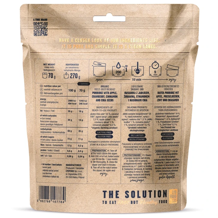 Lyo food Haferbrei mit Äpfeln, Preiselbeeren und Zimt