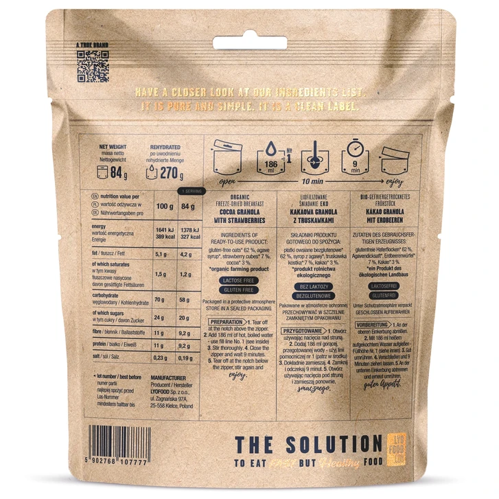 Glutenfreie Haferflocken, geröstet mit Kakao, Agavendicksaft und Erdbeeren. LYOFOOD Bistro ist fettarm und enthält wenig gesättigte Fettsäuren und ist eine Proteinquelle. Das Granola ist in wenigen Augenblicken verzehrfertig. Geben Sie einfach die richtige Menge heißes Wasser hinzu und warten Sie 5 Minuten.
