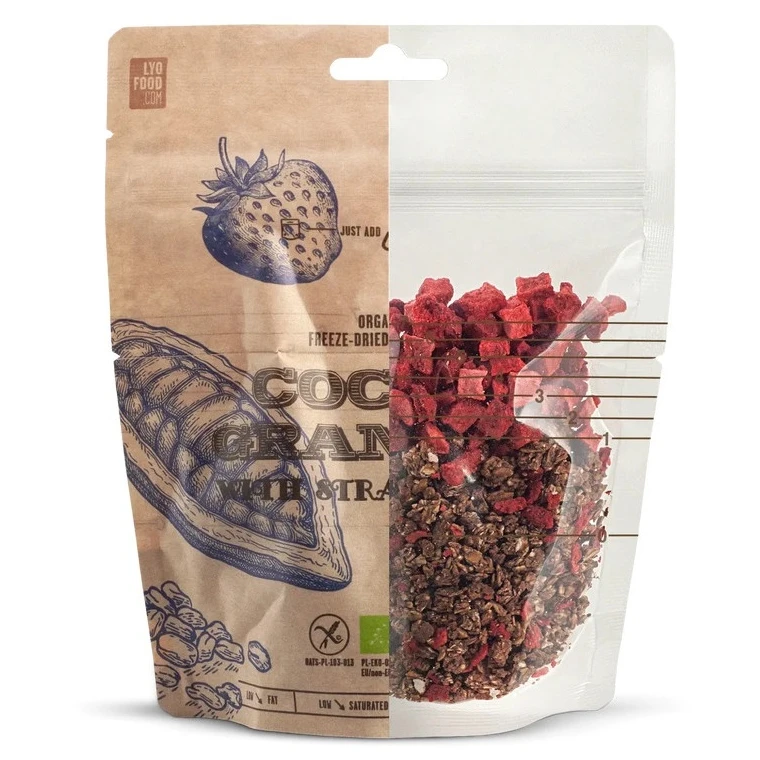 Glutenfreie Haferflocken, geröstet mit Kakao, Agavendicksaft und Erdbeeren. LYOFOOD Bistro ist fettarm und enthält wenig gesättigte Fettsäuren und ist eine Proteinquelle. Das Granola ist in wenigen Augenblicken verzehrfertig. Geben Sie einfach die richtige Menge heißes Wasser hinzu und warten Sie 5 Minuten.
