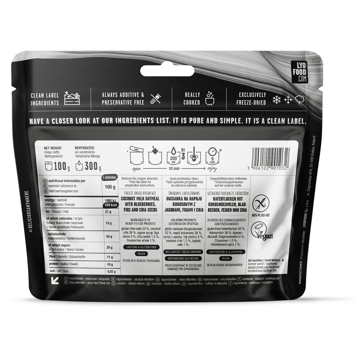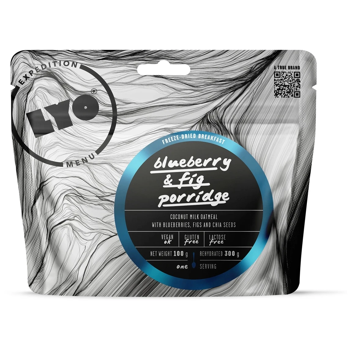 Gefriergetrocknetes Frühstück aus 100 % natürlichen Zutaten Lyo food mit dem Geschmack von in Kokosmilch gekochten Haferflocken, mit Heidelbeeren, Chiasamen, mit zusätzlichen Feigen und einem Hauch Agave, ist auch für Vegetarier geeignet.