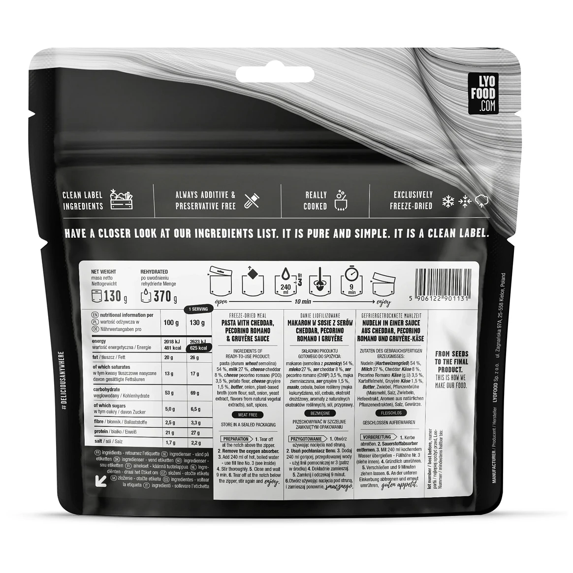 Mac & Cheese aus der Küche von LYOfood wird Sie mit seinem Geschmack begeistern. Es handelt sich um eine Kombination aus englischem Cheddar mit italienischem Pecorino Romano und Schweizer Gruyère. So entsteht ein wahres Festmahl ohne Fleisch.