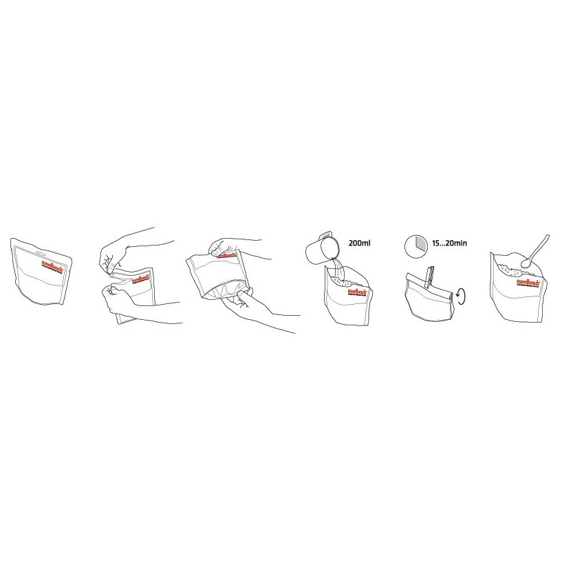 Wenn du auf einer Trekkingtour keine schweren Konserven mitschleppen möchtest und unterwegs trotzdem gerne gut essen gehst, dann ist food Travellunch die richtige Wahl für dich. Die Zubereitung ist schnell und ganz einfach. Das Futter mit kochendem Wasser übergießen, vermengen, den Beutel verschließen und 10–15 Minuten ziehen lassen. Der Energiewert dieser Mahlzeiten beträgt bis zu 1900 kJ = 440 kcal.