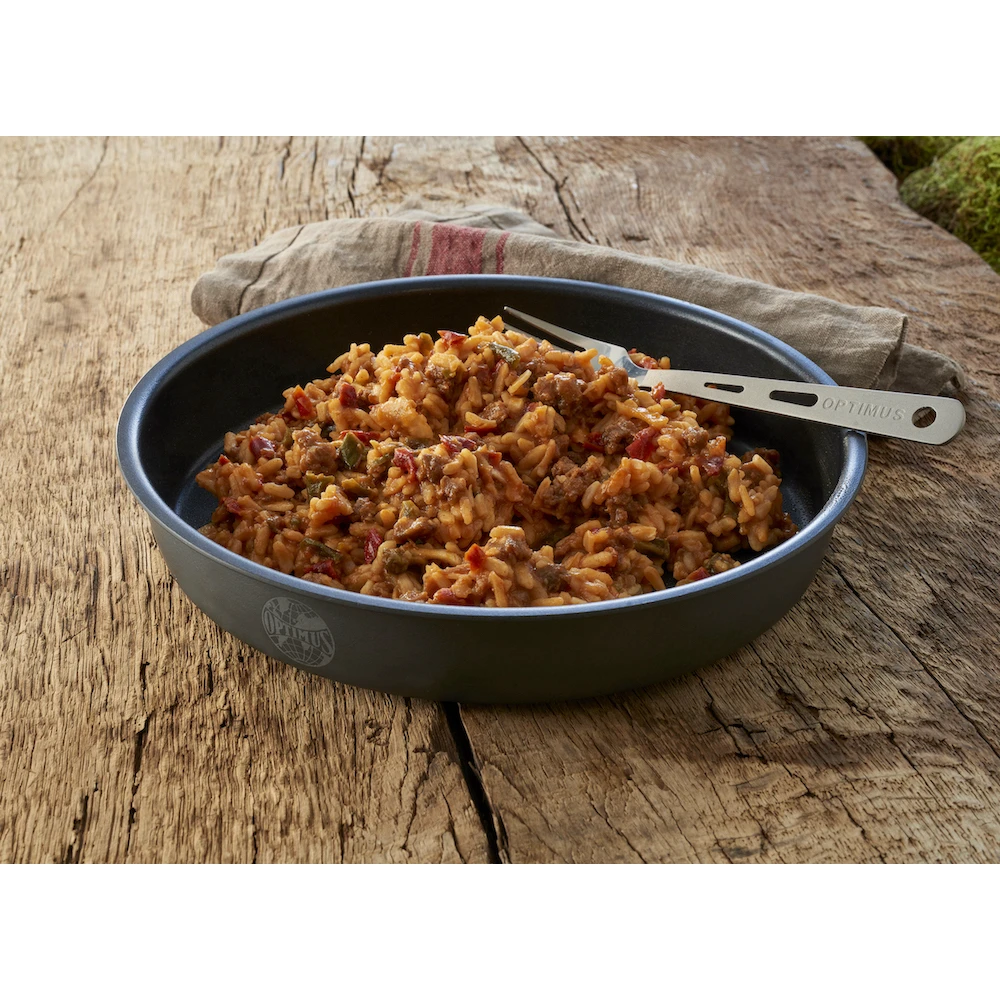 Buntes, saftiges Risotto mit Rindfleisch und Gemüse, gewürzt nach Balkanart. Im rehydrierten Zustand wiegt es 650 Gramm und wird sogar große Esser zufriedenstellen.