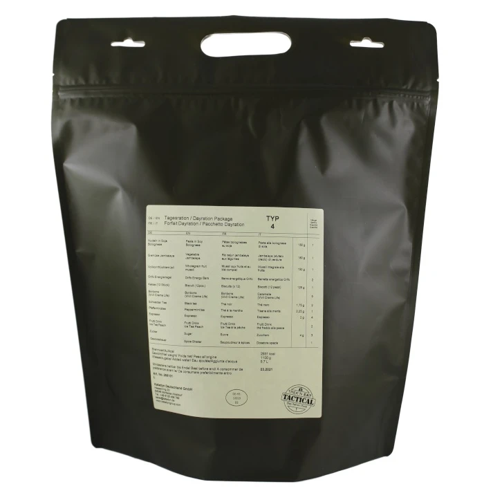 Das Kampfpaket Trek’n Eat beinhaltet neben Hauptmahlzeiten auch sorgfältig ausgewählte Getränke, einen Energieriegel, Snacks usw. Freuen Sie sich auf Nudeln a la Bolognese, kreolische Jambalaya, zwei Sorten Tee oder Kaffee. Und falls es tatsächlich zu einer Krise kommt, umfasst das Paket auch eine Survival Food Ration, eine energiereiche, laktosefreie Festnahrung mit einer Haltbarkeit von 20 Jahren.