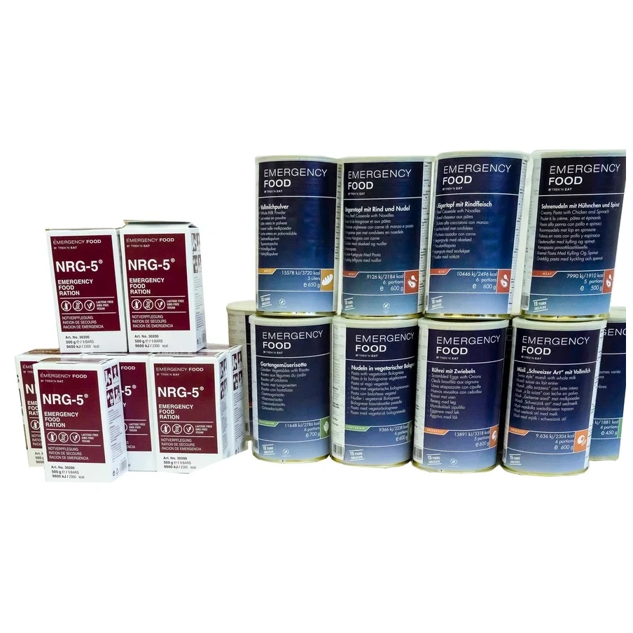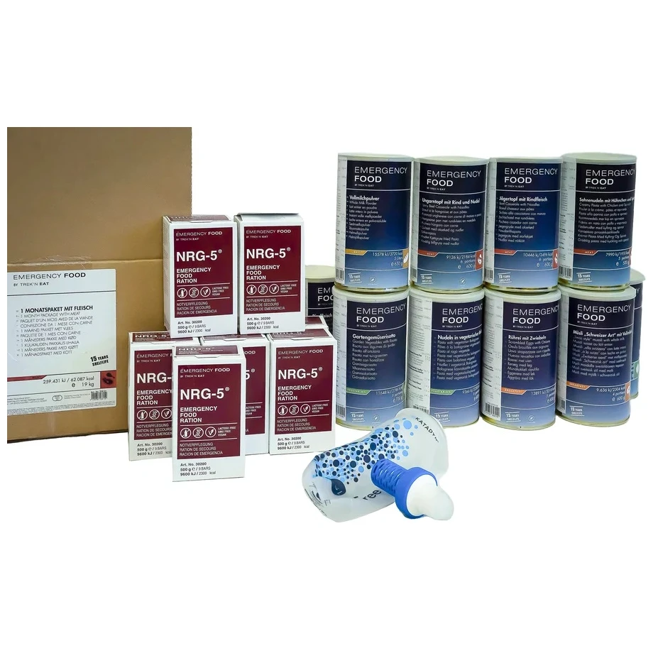 Zusätzlich hat der Hersteller dem Set 14 Packungen mit NRG-5-Dosen und einen flexiblen Flaschenfilter Katadyn Befreebeigelegt. Der Filter entfernt effektiv Bakterien, Protozoen und alle mechanischen Verunreinigungen aus dem Wasser. Verpackt ist das Ganze in einem Karton. Das Gewicht des gesamten Pakets beträgt ca. 20 kg.