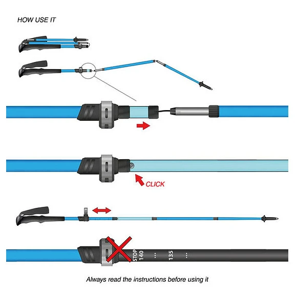 Die Art und Weise, wie die Stöcke in ein Transportmaß gepackt werden und gleichzeitig ihre Länge an den jeweiligen Benutzer angepasst wird.