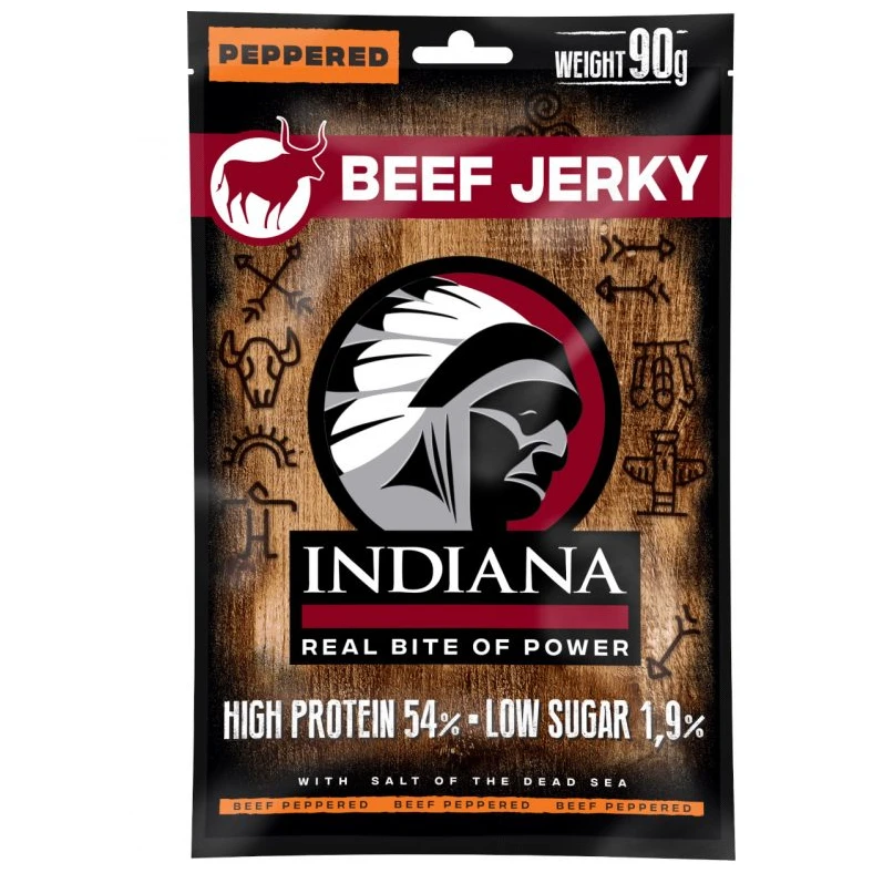Indiana beef Jerky ist ein Trockenfleisch, das nach alten indianischen Rezepturen mit neuesten Technologien hergestellt und an die Geschmacksknospen der Europäer angepasst wird. Indiana beef Jerky ist ein nicht fettiger, gesunder Snack, der reich an Proteinen ist und einen niedrigen Cholesteringehalt sowie einen sehr niedrigen Fettgehalt hat. Indiana beef Jerky enthält eine angeblich gesündere Art von Salz, K-Salz (KCl statt NaCl), das den menschlichen Organismus nicht negativ mit überschüssigem Natrium belastet.