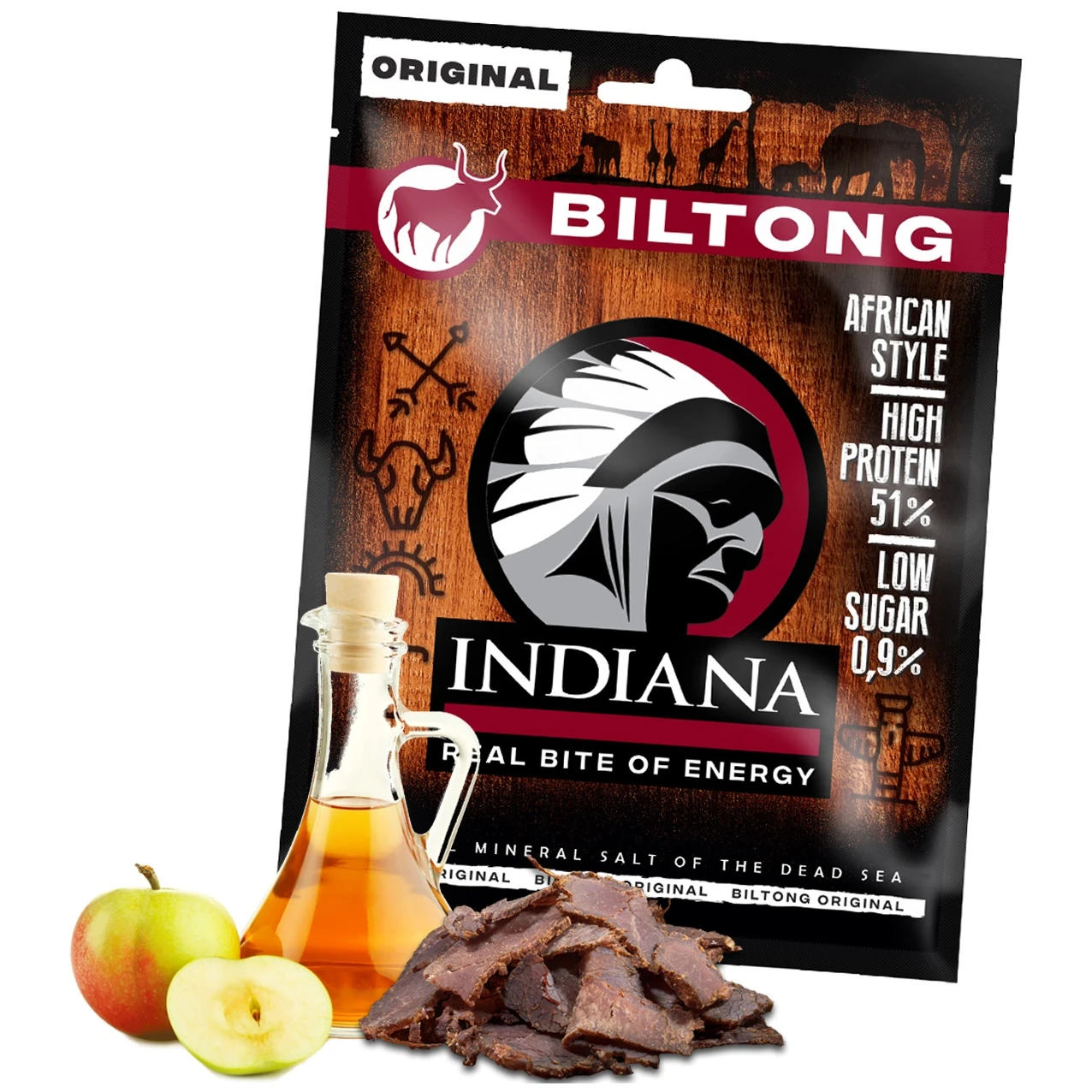 Indiana beef Jerky ist ein Trockenfleisch, das nach alten indianischen Rezepturen mit neuesten Technologien hergestellt und an die Geschmacksknospen der Europäer angepasst wird. Indiana beef Jerky ist ein nicht fettiger, gesunder Snack, der reich an Proteinen ist und einen niedrigen Cholesteringehalt sowie einen sehr niedrigen Fettgehalt hat. Indiana beef Jerky enthält eine angeblich gesündere Art von Salz, K-Salz (KCl statt NaCl), das den menschlichen Organismus nicht negativ mit überschüssigem Natrium belastet.