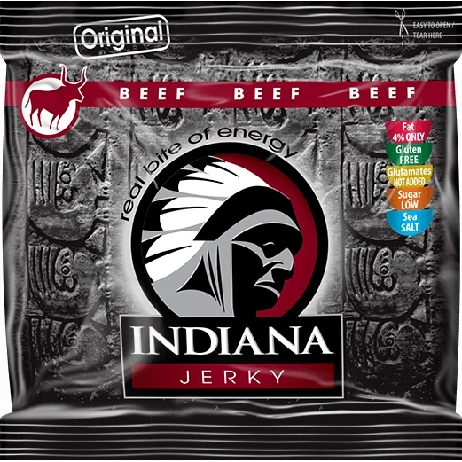 Indiana beef Jerky ist ein Trockenfleisch, das nach alten indianischen Rezepturen mit neuesten Technologien hergestellt und an die Geschmacksknospen der Europäer angepasst wird. Indiana beef Jerky ist ein nicht fettiger, gesunder Snack, der reich an Proteinen ist und einen niedrigen Cholesteringehalt sowie einen sehr niedrigen Fettgehalt hat. Indiana beef Jerky enthält eine angeblich gesündere Art von Salz, K-Salz (KCl statt NaCl), das den menschlichen Organismus nicht negativ mit überschüssigem Natrium belastet.