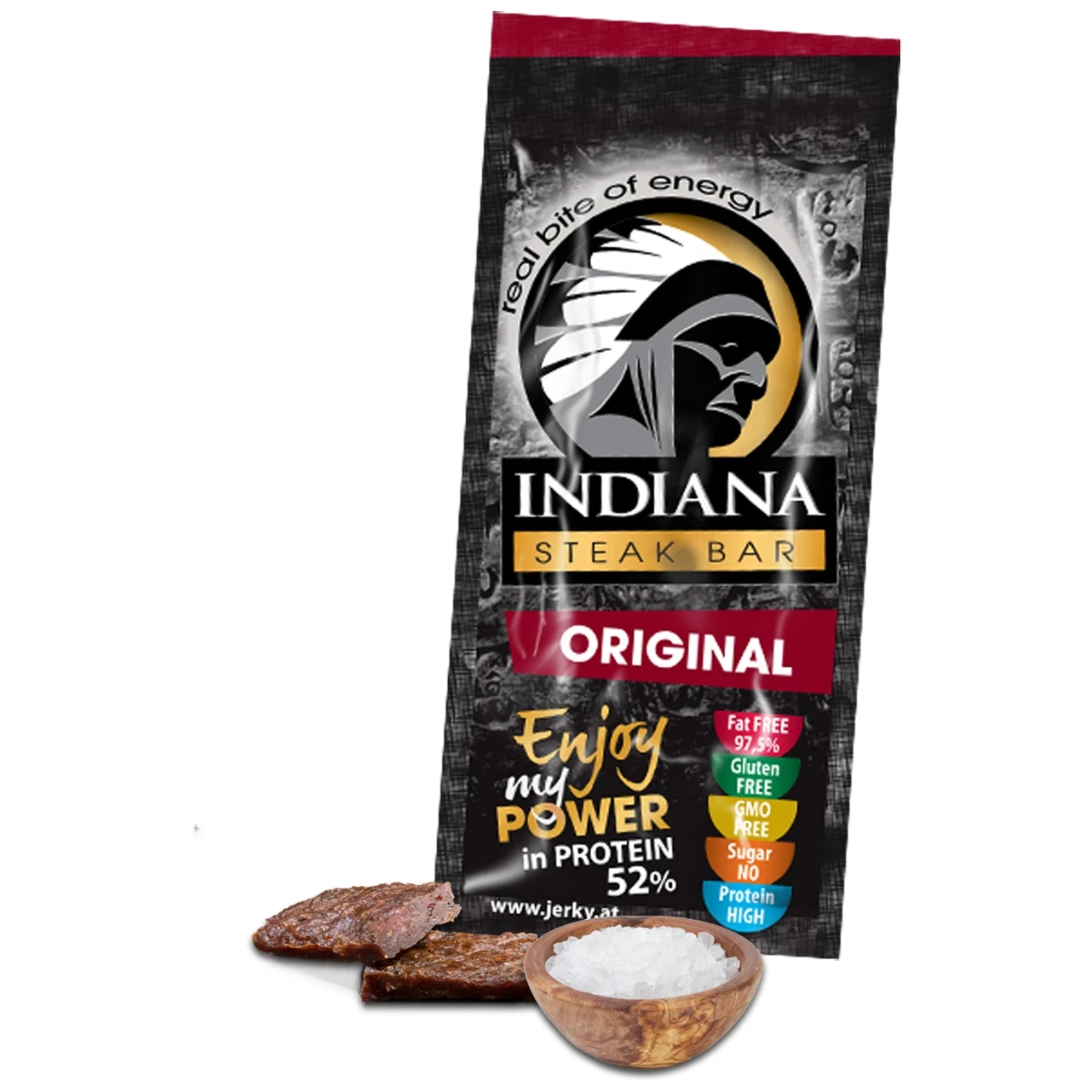 Indiana beef Jerky ist ein Trockenfleisch, das nach alten indianischen Rezepturen mit neuesten Technologien hergestellt und an die Geschmacksknospen der Europäer angepasst wird. Indiana beef Jerky ist ein nicht fettiger, gesunder Snack, der reich an Proteinen ist und einen niedrigen Cholesteringehalt sowie einen sehr niedrigen Fettgehalt hat. Indiana beef Jerky enthält eine angeblich gesündere Art von Salz, K-Salz (KCl statt NaCl), das den menschlichen Organismus nicht negativ mit überschüssigem Natrium belastet.