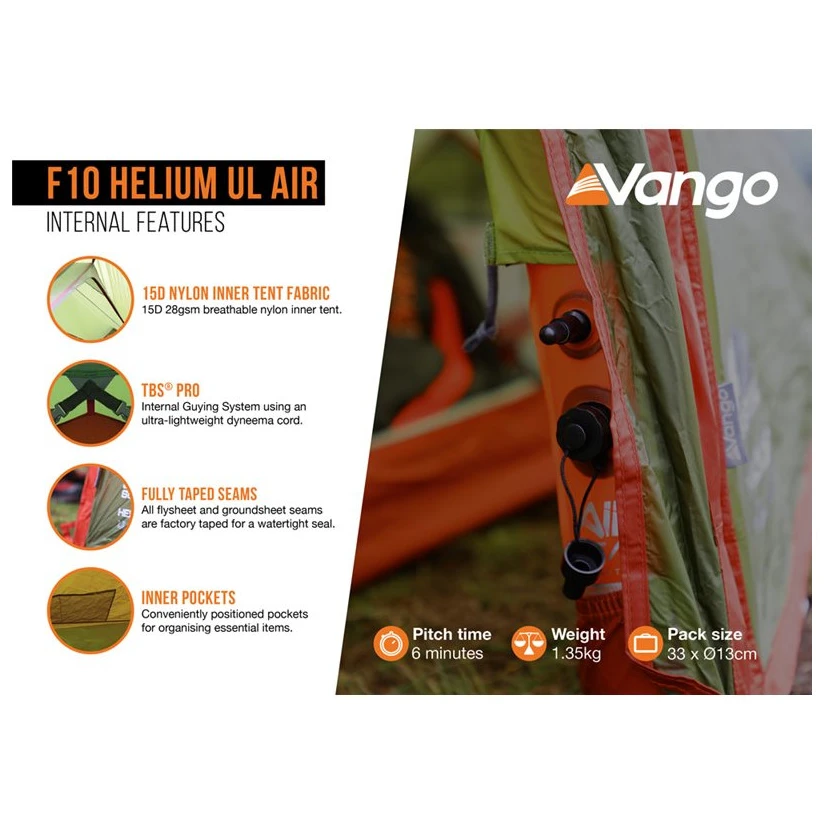 Das Vango Helium Ultralight Air 1-Personen-Zelt verfügt über ein Hybrid-Tunnel-Design und lässt sich schnell aufbauen. Da es sich um die Serie Ultralighthandelt, spüren Sie das Zelt auf der Waage kaum.