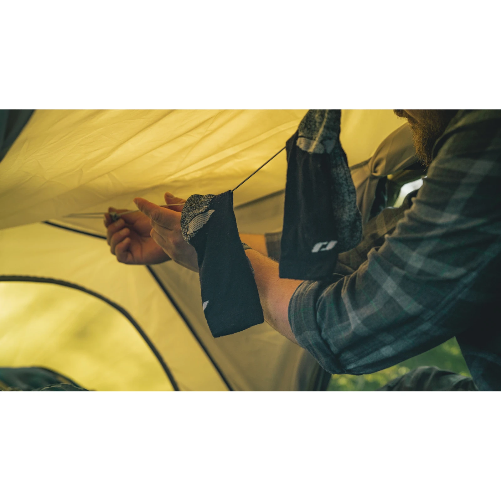 - Außenzelt: HydroTex HD RS, 75D Polyester 190T, Ripstop, feuerhemmend, 100 % Polyester (5.000 mm)